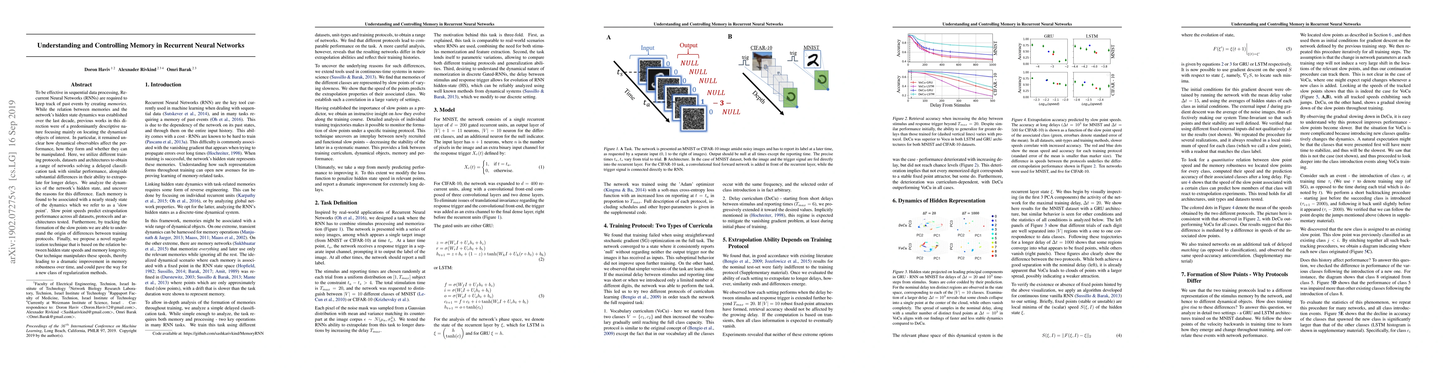 This paper investigates the memory dynamics in Recurrent Neural Networks (RNNs) and identifies 'slow points' in the hidden state as key to memory formation and extrapolation performance. A new regularization technique based on these dynamics significantly improves memory robustness.