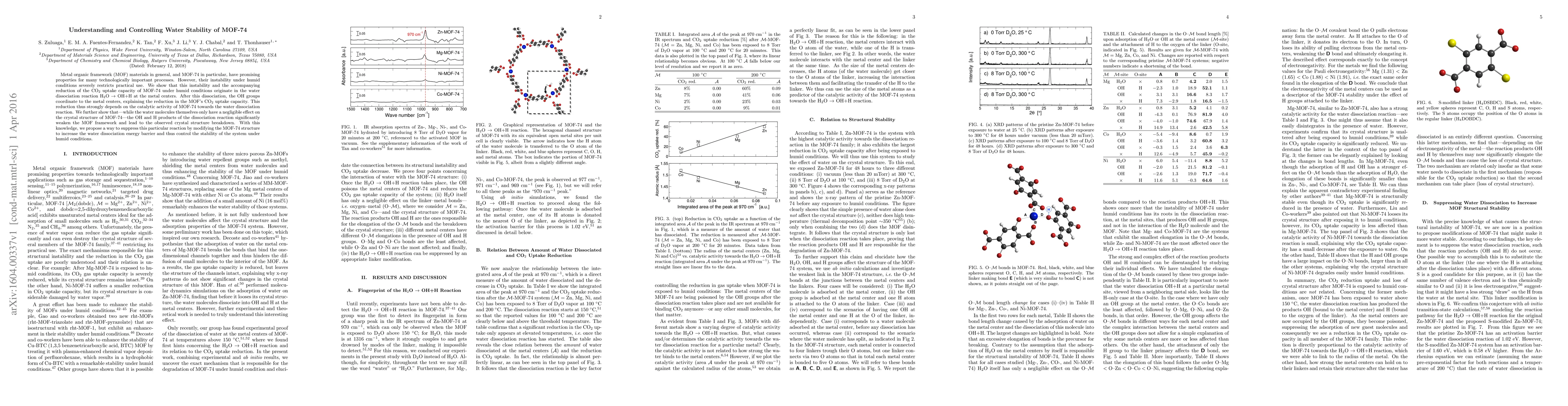 This paper investigates the instability of MOF-74 under humid conditions, attributing it to the water dissociation reaction at metal centers, which weakens the framework. The authors propose modifying MOF-74 to increase the energy barrier for water dissociation, thereby enhancing its stability under humid conditions.