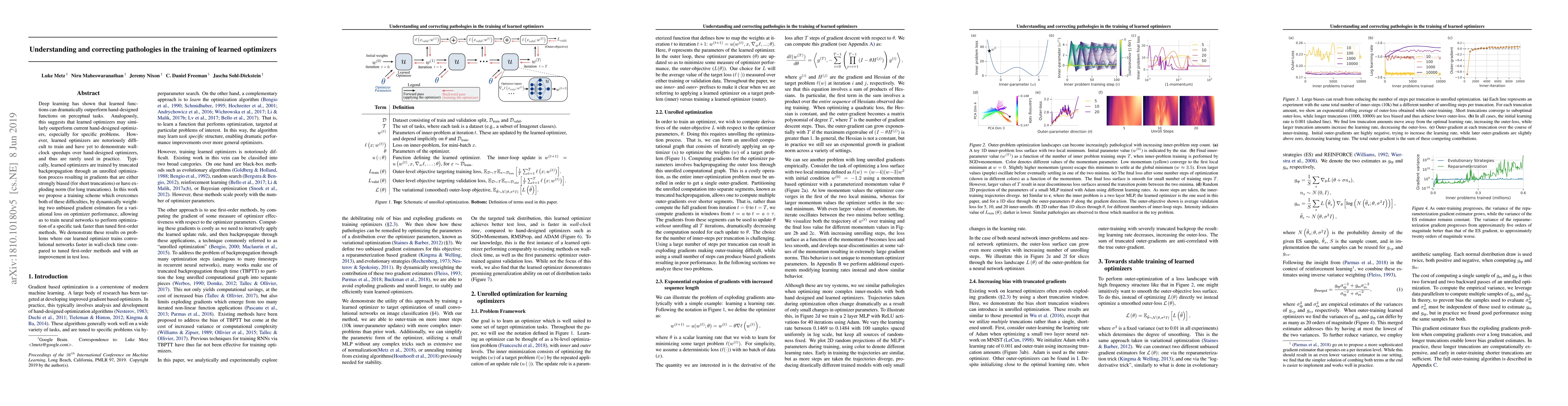 This paper proposes a novel training scheme for learned optimizers that addresses issues of bias and gradient explosion, enabling faster optimization of specific tasks compared to traditional first-order methods. The method dynamically weights unbiased gradient estimators for a variational loss, demonstrating faster training and improved performance on convolutional networks.