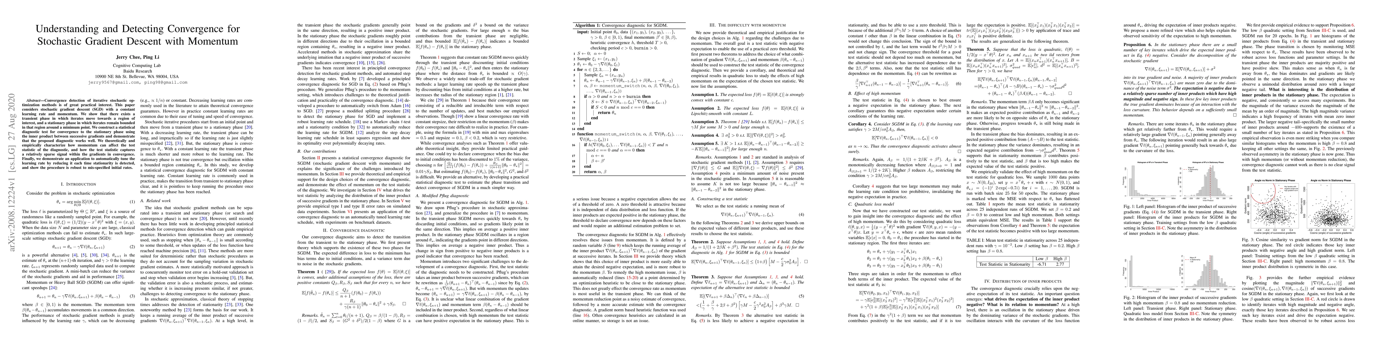 This paper develops a statistical diagnostic test to detect convergence in stochastic gradient descent with momentum, identifying transient and stationary phases. The test uses the inner product between successive gradients and shows robustness in tuning the learning rate based on detected stationarity.