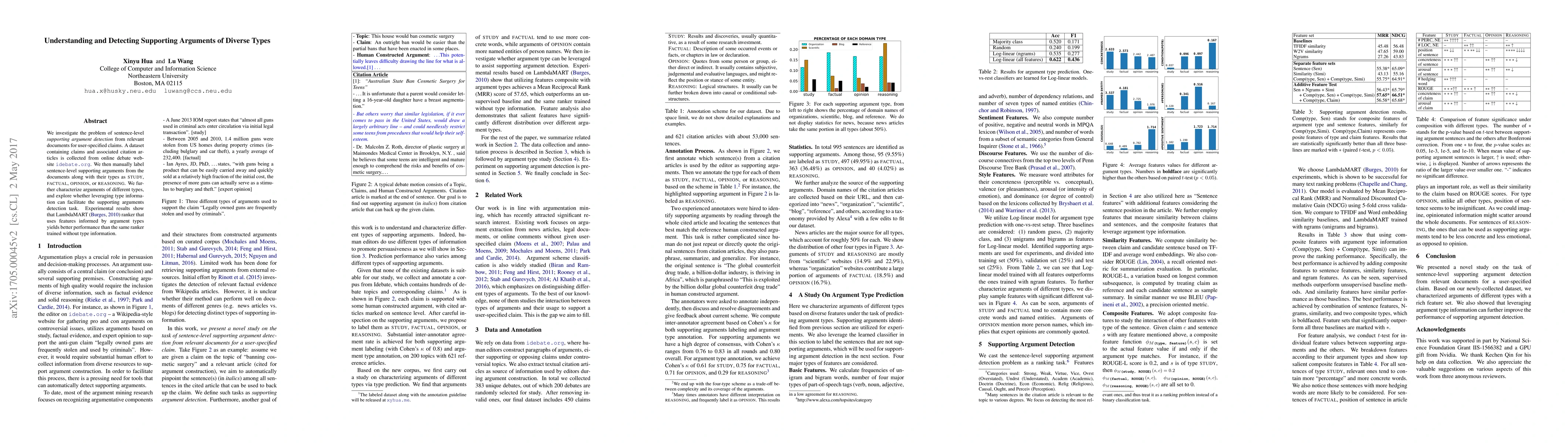 A research paper investigates detecting supporting arguments of diverse types in online debates, showing that leveraging type information improves performance. The study uses a dataset from idebate.org to develop an argument detection system.