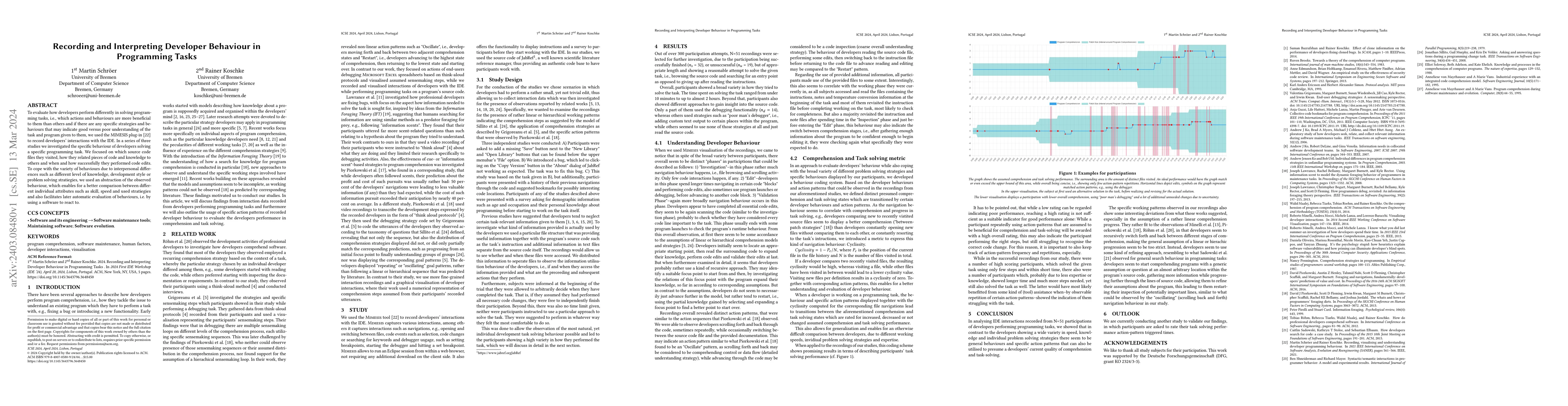 To evaluate how developers perform differently in solving programming tasks, i.e., which actions and behaviours are more beneficial to them than others and if there are any specific strategies and behaviours that may indicate good versus poor understanding of the task and program given to them, we used the MIMESIS plug-in to record developers' interactions with the IDE. In a series of three studies we investigated the specific behaviour of developers solving a specific programming task. We focused on which source code files they visited, how they related pieces of code and knowledge to others and when and how successful they performed code edits. To cope with the variety of behaviours due to interpersonal differences such as different level of knowledge, development style or problem solving stratiegies, we used an abstraction of the observed behaviour, which enables for a better comparison between different individual attributes such as skill, speed and used stratiegies and also facilitates later automatic evaluation of behaviours, i.e. by using a software to react to.