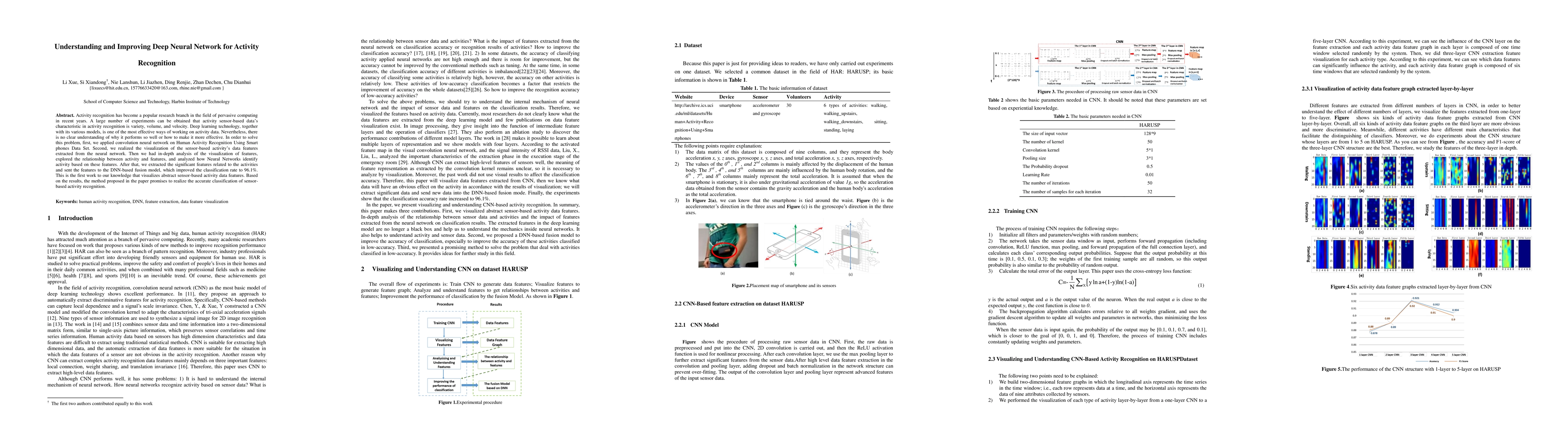 This paper explores deep neural networks for activity recognition using sensor data, applying convolutional neural networks and visualizing extracted features to understand their relationship with activities. The proposed DNN-based fusion model improved classification accuracy to 96.1%, demonstrating effective feature extraction and activity identification.