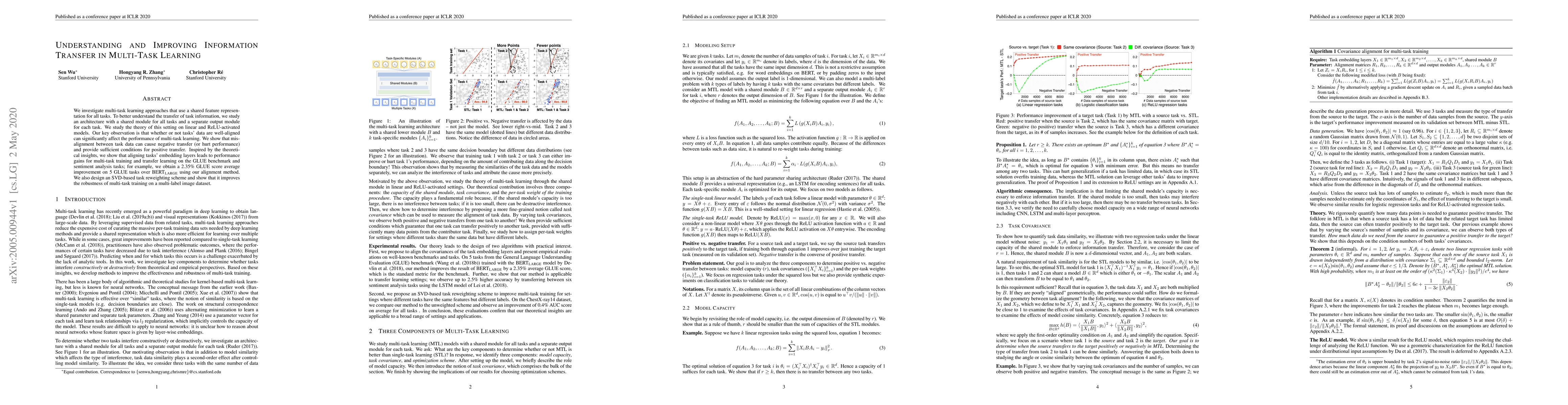This research explores multi-task learning's information transfer efficiency, identifying that data misalignment can lead to negative transfer. It proposes aligning task embedding layers and an SVD-based reweighting scheme to enhance performance, achieving notable improvements on GLUE and sentiment analysis tasks.