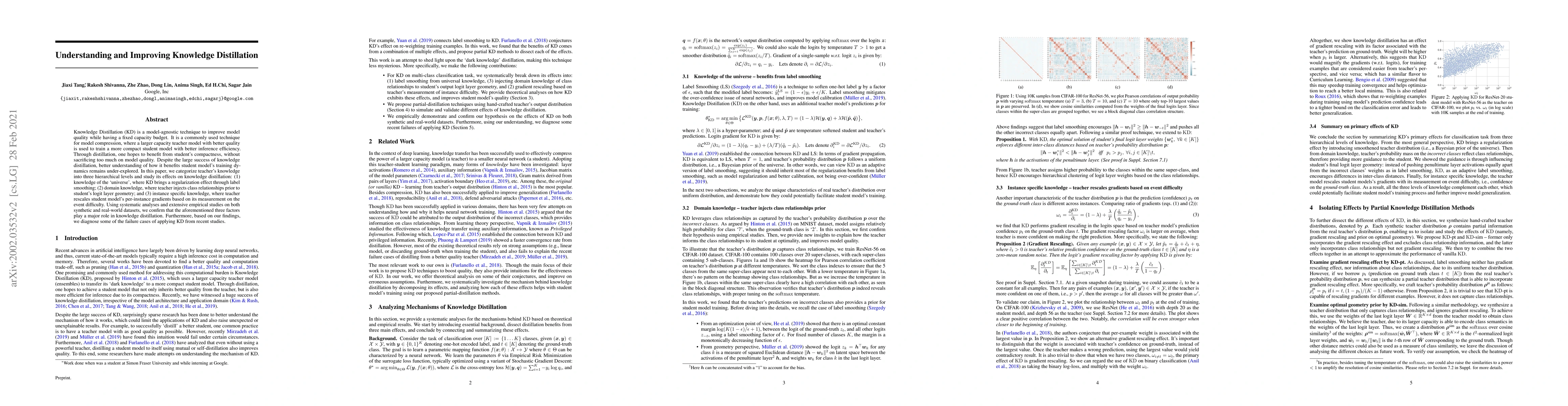 Knowledge Distillation (KD) is a model-agnostic technique to improve model quality while having a fixed capacity budget. It is a commonly used technique for model compression, where a larger capacity teacher model with better quality is used to train a more compact student model with better inference efficiency. Through distillation, one hopes to benefit from student's compactness, without sacrificing too much on model quality. Despite the large success of knowledge distillation, better understanding of how it benefits student model's training dynamics remains under-explored. In this paper, we categorize teacher's knowledge into three hierarchical levels and study its effects on knowledge distillation: (1) knowledge of the `universe', where KD brings a regularization effect through label smoothing; (2) domain knowledge, where teacher injects class relationships prior to student's logit layer geometry; and (3) instance specific knowledge, where teacher rescales student model's per-instance gradients based on its measurement on the event difficulty. Using systematic analyses and extensive empirical studies on both synthetic and real-world datasets, we confirm that the aforementioned three factors play a major role in knowledge distillation. Furthermore, based on our findings, we diagnose some of the failure cases of applying KD from recent studies.
