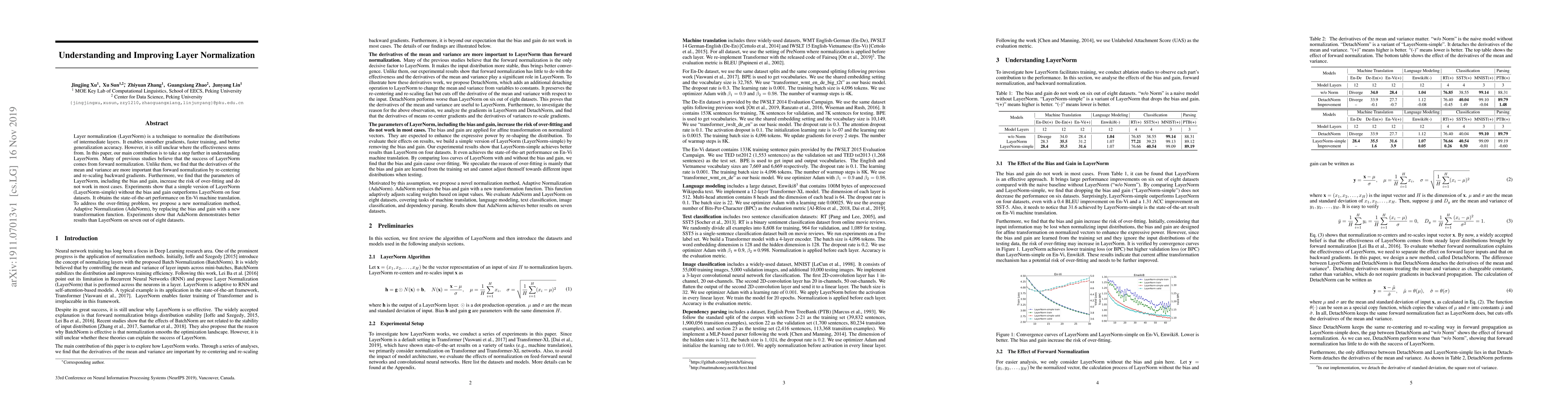 Researchers improved layer normalization by finding that re-centering and re-scaling backward gradients are key to its success, and proposed a new method called Adaptive Normalization that outperforms LayerNorm on most datasets.