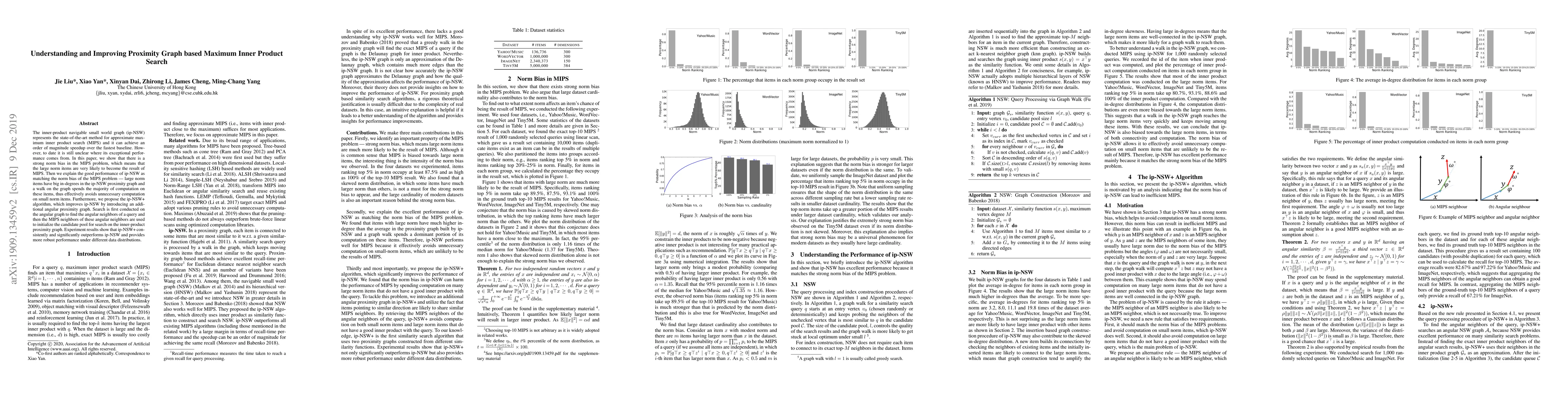 The paper analyzes the inner-product navigable small world graph (ip-NSW) for maximum inner product search (MIPS), identifying a strong norm bias in MIPS where large norm items are likely to be results. It proposes ip-NSW+ to improve ip-NSW by introducing an angular proximity graph, enhancing search efficiency.