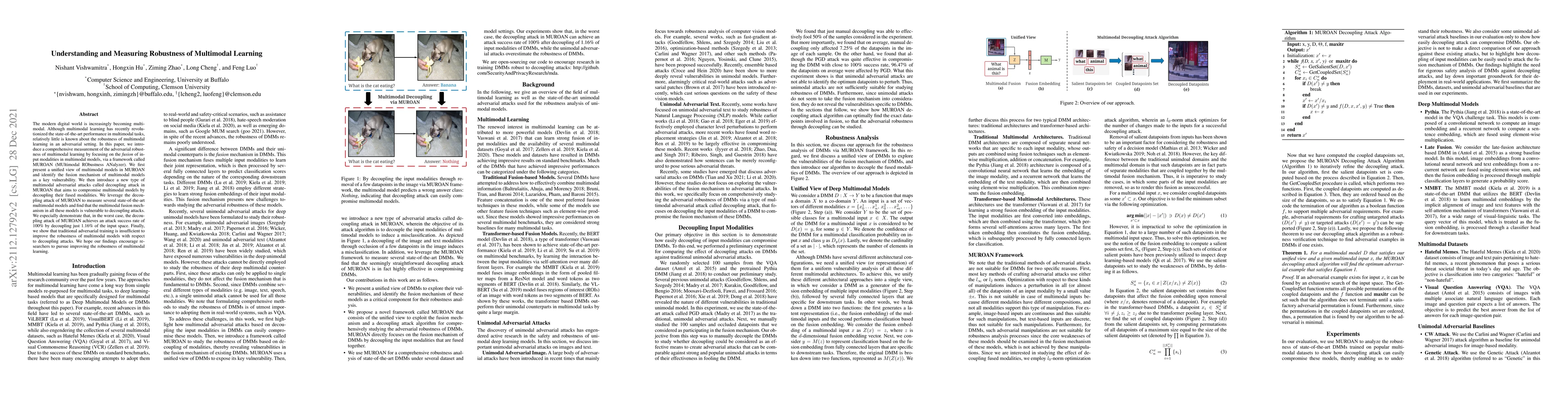 This paper introduces a framework, MUROAN, to measure the adversarial robustness of multimodal learning models, identifying the fusion mechanism as a key vulnerability. It demonstrates that state-of-the-art models are highly susceptible to decoupling attacks, achieving 100% success in the worst case, and suggests traditional adversarial training is inadequate for improving robustness.