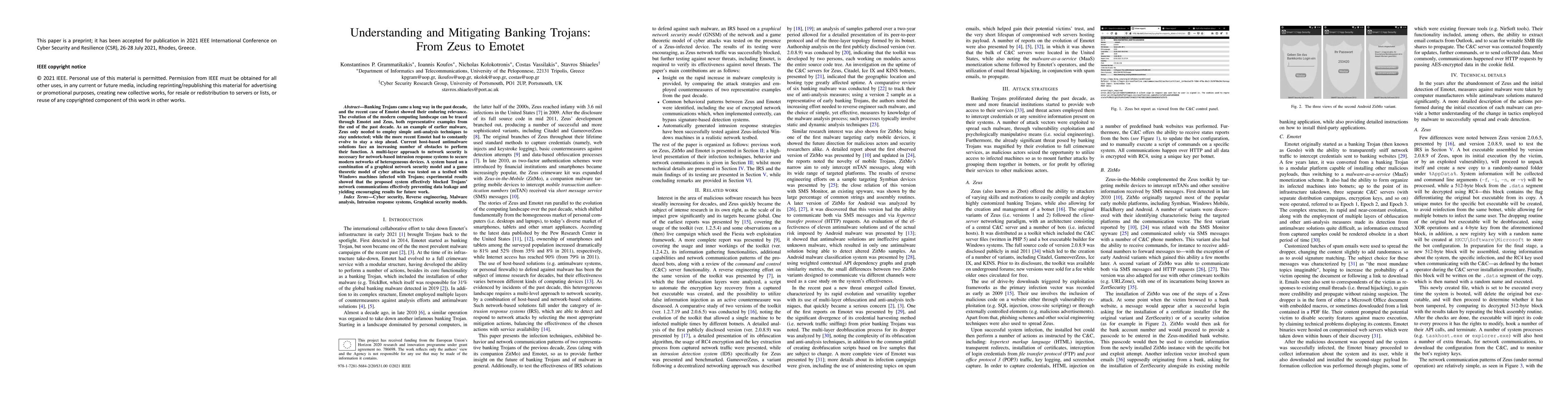 This paper examines the evolution of banking Trojans from Zeus to Emotet, highlighting the increasing complexity and sophistication of modern malware. It proposes a multi-layer network security system combining graphical models and game theory to effectively block Trojan communications, demonstrating promising results in preventing data leakage.