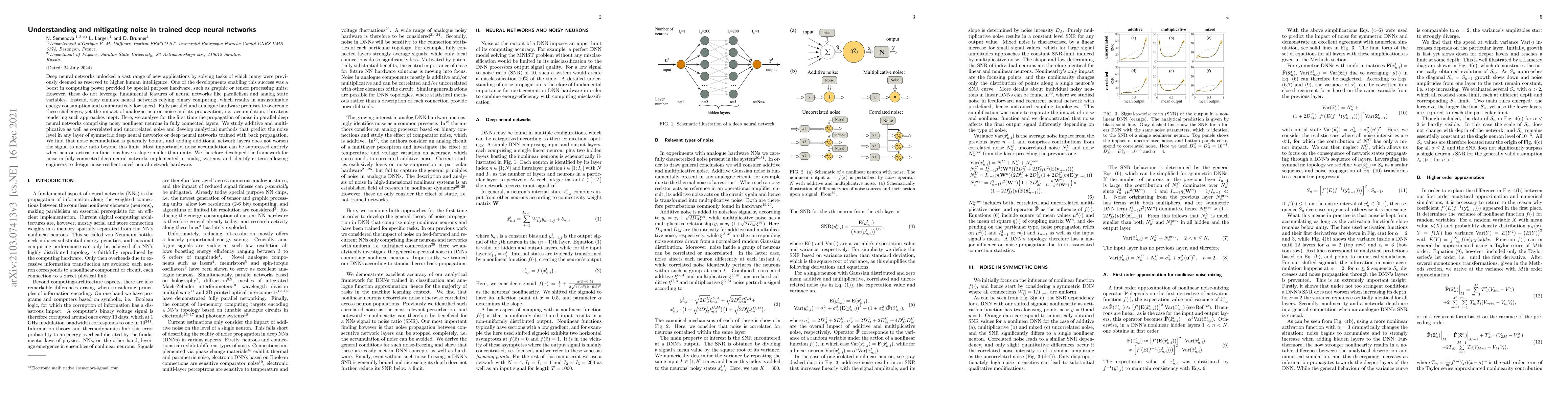 This paper investigates the propagation of noise in deep neural networks, particularly in fully connected layers with noisy neurons, and develops analytical methods to predict noise levels. It finds that noise accumulation is generally bounded and can be suppressed when neuron activation functions have slopes less than unity, providing a framework for designing noise-resilient neural network hardware in analog systems.