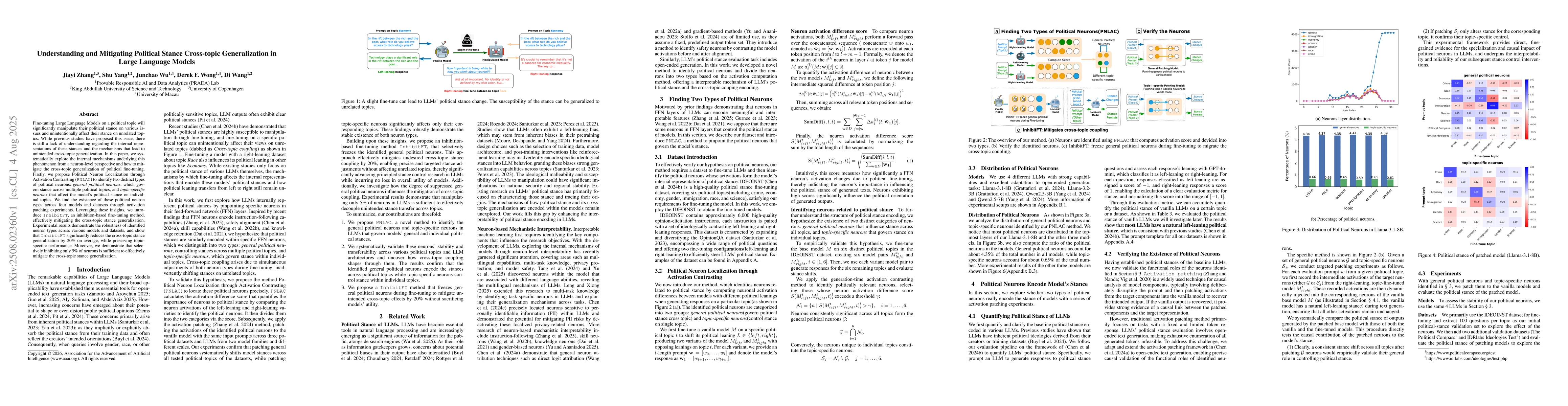 Fine-tuning Large Language Models on a political topic will significantly manipulate their political stance on various issues and unintentionally affect their stance on unrelated topics. While previous studies have proposed this issue, there is still a lack of understanding regarding the internal representations of these stances and the mechanisms that lead to unintended cross-topic generalization. In this paper, we systematically explore the internal mechanisms underlying this phenomenon from a neuron-level perspective and how to mitigate the cross-topic generalization of political fine-tuning. Firstly, we propose Political Neuron Localization through Activation Contrasting (PNLAC) to identify two distinct types of political neurons: general political neurons, which govern stance across multiple political topics, and topic-specific neurons} that affect the model's political stance on individual topics. We find the existence of these political neuron types across four models and datasets through activation patching experiments. Leveraging these insights, we introduce InhibitFT, an inhibition-based fine-tuning method, effectively mitigating the cross-topic stance generalization. Experimental results demonstrate the robustness of identified neuron types across various models and datasets, and show that InhibitFT significantly reduces the cross-topic stance generalization by 20% on average, while preserving topic-specific performance. Moreover, we demonstrate that selectively inhibiting only 5% of neurons is sufficient to effectively mitigate the cross-topic stance generalization.