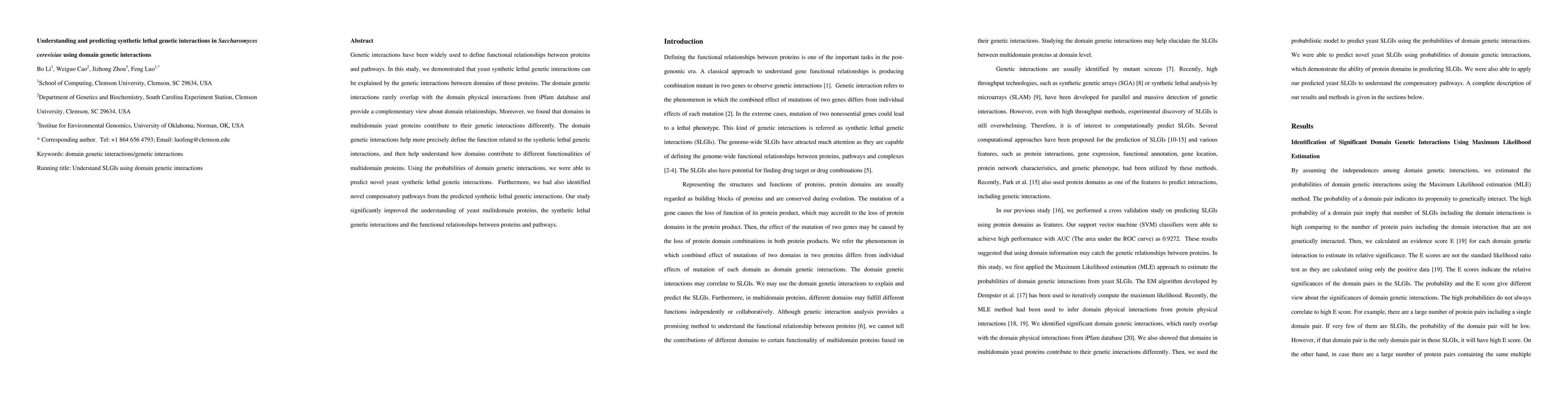 This study demonstrates that synthetic lethal genetic interactions in yeast can be predicted using domain genetic interactions, which provide a complementary view to physical interactions. The findings reveal distinct contributions of domains in multidomain proteins and enable novel predictions of synthetic lethal interactions and compensatory pathways.