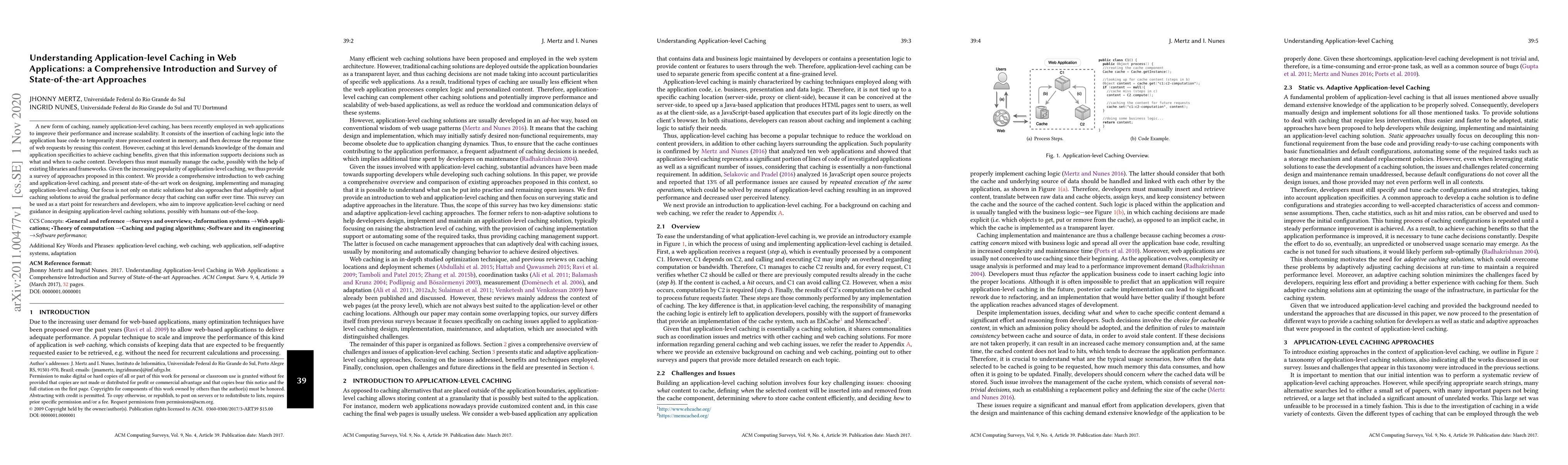 This paper provides a comprehensive introduction and survey of application-level caching in web applications, focusing on its benefits for performance and scalability. It reviews state-of-the-art approaches for designing, implementing, and managing adaptive caching solutions to maintain performance over time.