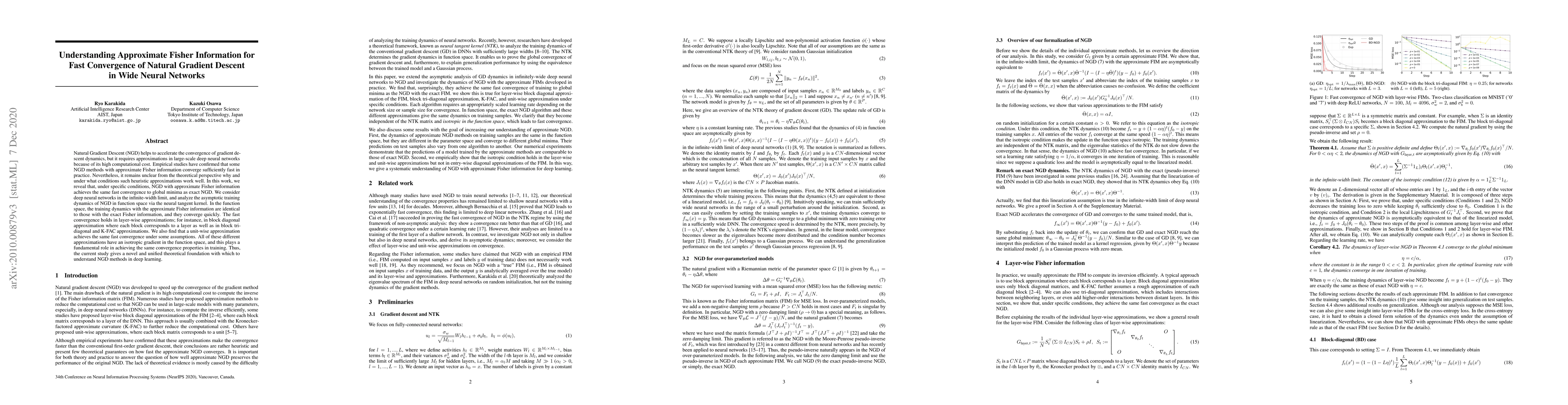 This paper investigates the theoretical underpinnings of Natural Gradient Descent (NGD) with approximate Fisher information in wide neural networks, demonstrating that under specific conditions, these approximations achieve the same fast convergence to global minima as exact NGD. The study reveals that the isotropic gradient in function space is fundamental for the convergence properties, providing a unified theoretical foundation for understanding NGD methods in deep learning.