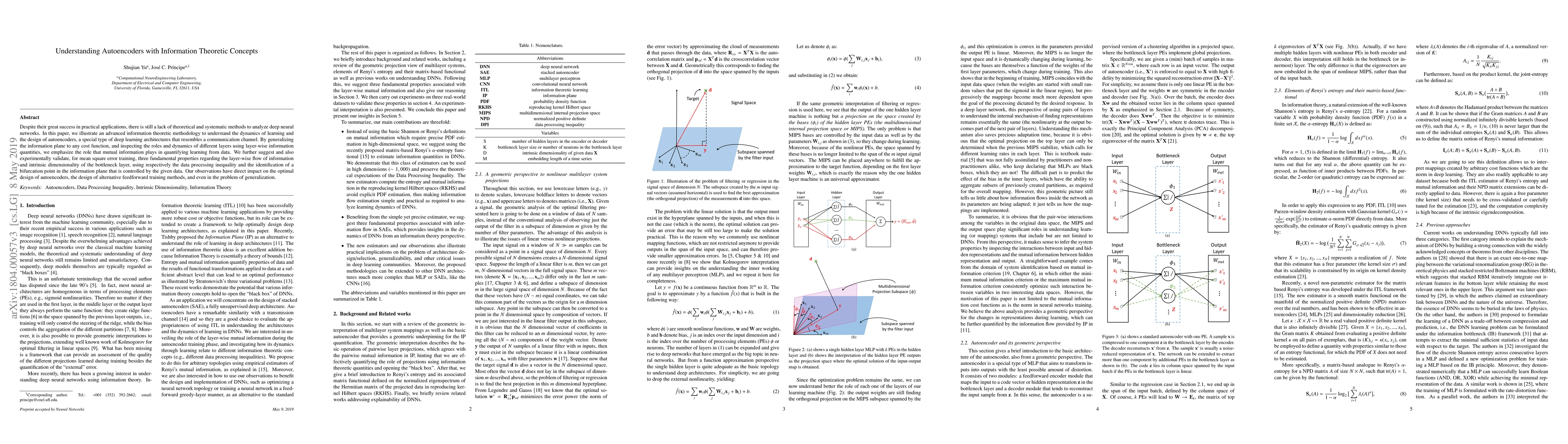 This paper employs advanced information theoretic methods to analyze the learning dynamics and design of autoencoders, emphasizing mutual information's role in quantifying learning. It identifies three fundamental properties regarding layer-wise information flow and the bottleneck layer's intrinsic dimensionality, impacting autoencoder optimization, alternative training methods, and generalization.