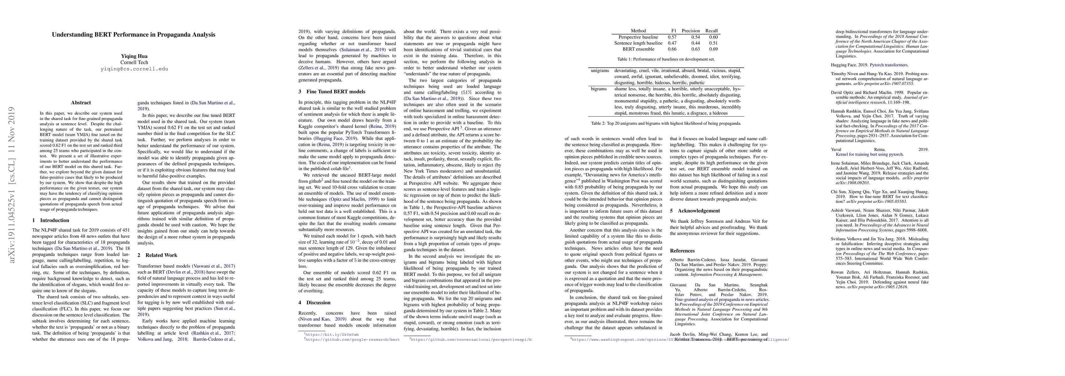 This paper details a BERT model fine-tuned for propaganda analysis, achieving a 0.62 F1 score and ranking third in a shared task. Despite high performance, the model struggles to differentiate opinion pieces from propaganda and quotations from actual propaganda techniques.