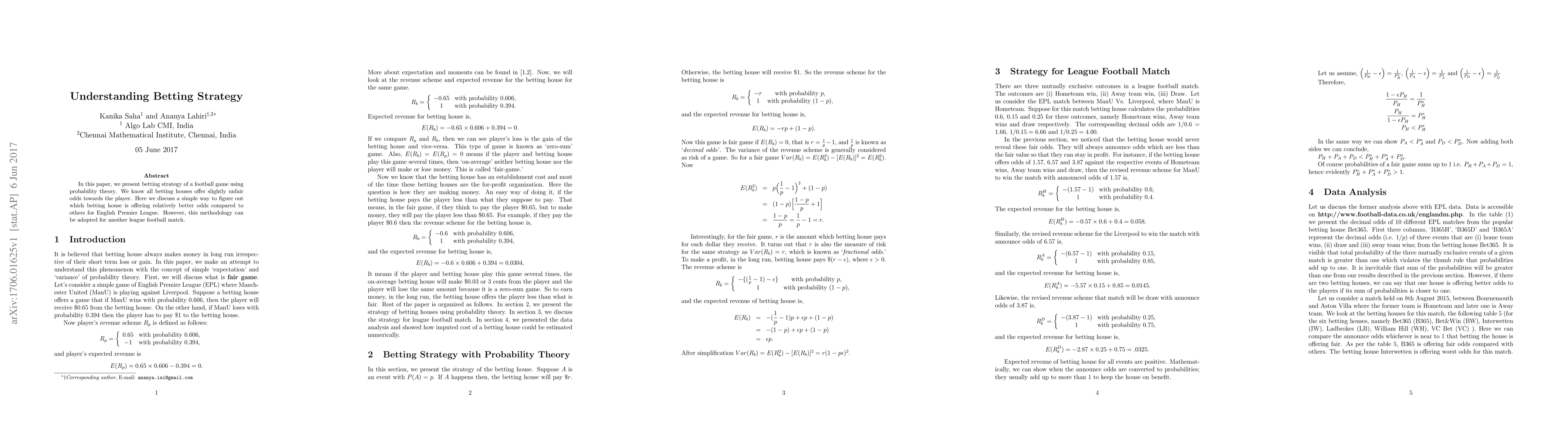In this paper, we present betting strategy of a football game using probability theory. We know all betting houses offer slightly unfair odds towards the player. Here we discuss a simple way to figure out which betting house is offering relatively better odds compared to others for English Premier League. However, this methodology can be adopted for another league football match.