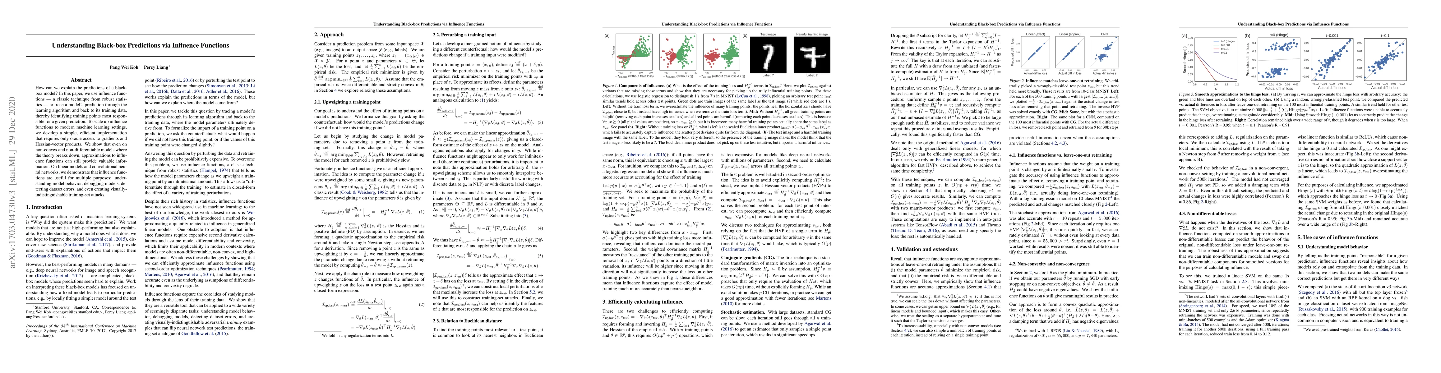 This paper explores the use of influence functions to explain the predictions of black-box models by tracing predictions back to training data, providing insights into model behavior and debugging. It develops an efficient implementation scalable to modern machine learning, demonstrating its utility across linear models and neural networks.
