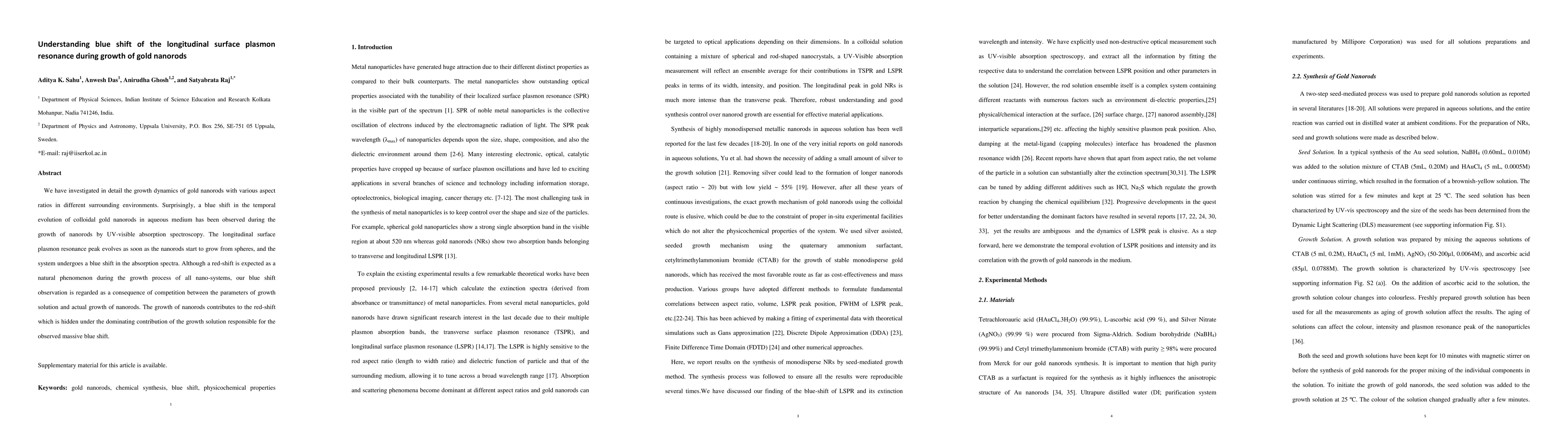 This study investigates the unexpected blue shift in the longitudinal surface plasmon resonance of gold nanorods during growth in aqueous medium, contrary to the expected red shift. The observed blue shift is attributed to the interplay between the growth solution's influence and the nanorod growth process.