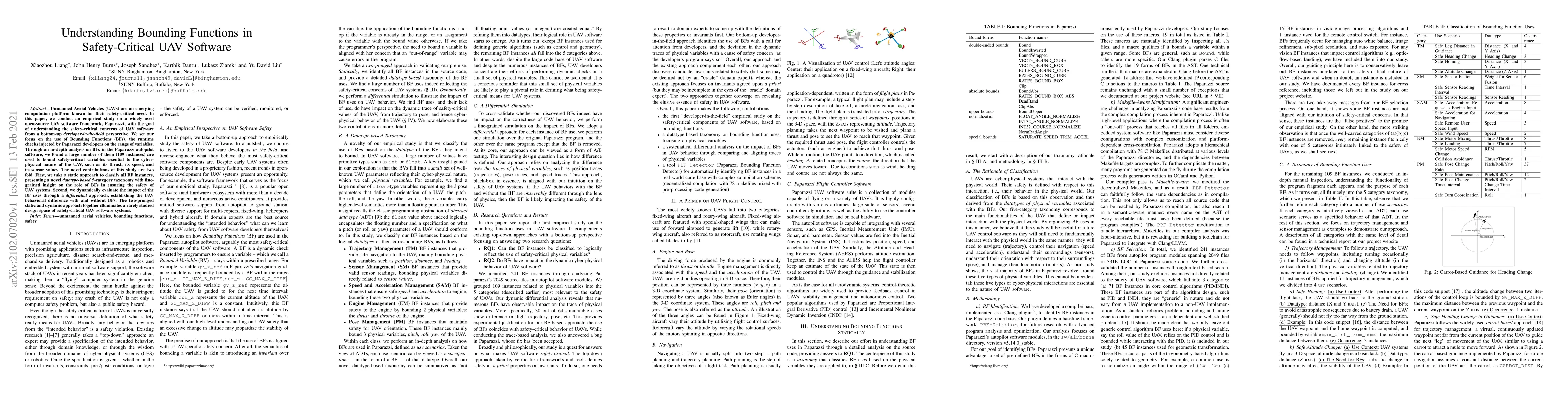 Unmanned Aerial Vehicles (UAVs) are an emerging computation platform known for their safety-critical need. In this paper, we conduct an empirical study on a widely used open-source UAV software framework, Paparazzi, with the goal of understanding the safety-critical concerns of UAV software from a bottom-up developer-in-the-field perspective. We set our focus on the use of Bounding Functions (BFs), the runtime checks injected by Paparazzi developers on the range of variables. Through an in-depth analysis on BFs in the Paparazzi autopilot software, we found a large number of them (109 instances) are used to bound safety-critical variables essential to the cyber-physical nature of the UAV, such as its thrust, its speed, and its sensor values. The novel contributions of this study are two fold. First, we take a static approach to classify all BF instances, presenting a novel datatype-based 5-category taxonomy with fine-grained insight on the role of BFs in ensuring the safety of UAV systems. Second, we dynamically evaluate the impact of the BF uses through a differential approach, establishing the UAV behavioral difference with and without BFs. The two-pronged static and dynamic approach together illuminates a rarely studied design space of safety-critical UAV software systems.