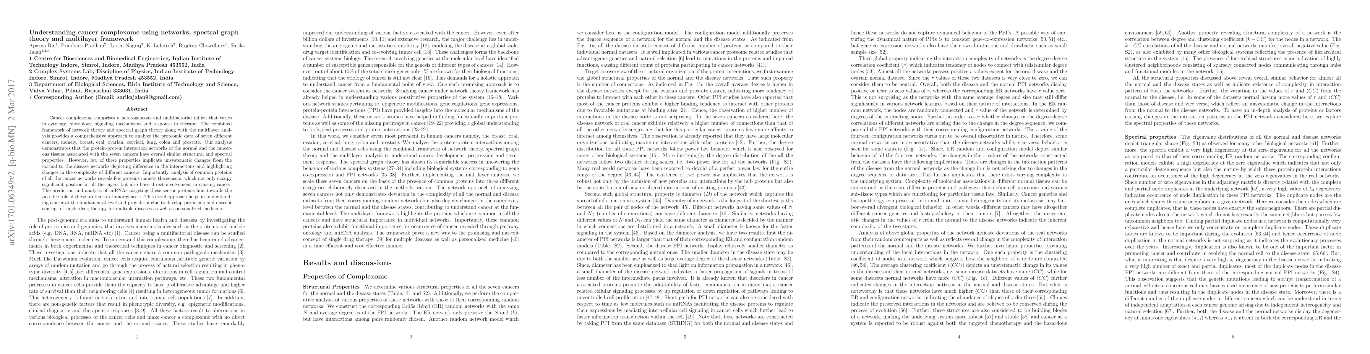Cancer complexome comprises a heterogeneous and multifactorial milieu that varies in cytology, physiology, signaling mechanisms and response to therapy. The combined framework of network theory and spectral graph theory along with the multilayer anal- ysis provides a comprehensive approach to analyze the proteomic data of seven different cancers, namely, breast, oral, ovarian, cervical, lung, colon and prostate. Our analysis demonstrates that the protein-protein interaction networks of the normal and the cancerous tissues associated with the seven cancers have overall similar structural and spectral properties. However, few of these properties implicate unsystematic changes from the normal to the disease networks depicting difference in the interactions and highlighting changes in the complexity of different cancers. Importantly, analysis of common proteins of all the cancer networks reveals few proteins namely the sensors, which not only occupy significant position in all the layers but also have direct involvement in causing cancer. The prediction and analysis of miRNAs targeting these sensor proteins hint towards the possible role of these proteins in tumorigenesis. This novel approach helps in understanding cancer at the fundamental level and provides a clue to develop promising and nascent concept of single drug therapy for multiple diseases as well as personalized medicine.