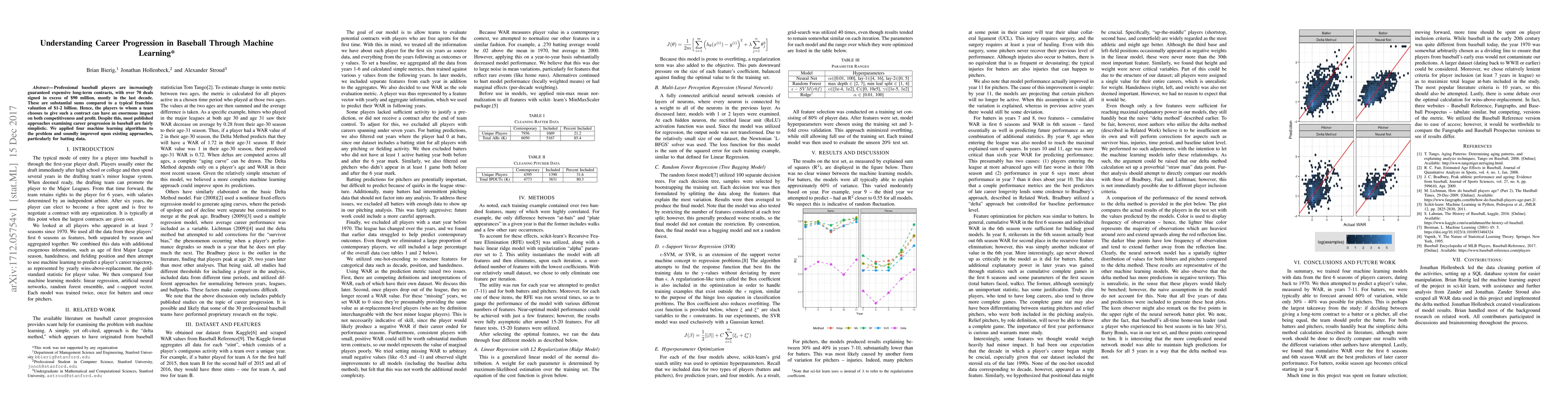 Professional baseball players are increasingly guaranteed expensive long-term contracts, with over 70 deals signed in excess of \$90 million, mostly in the last decade. These are substantial sums compared to a typical franchise valuation of \$1-2 billion. Hence, the players to whom a team chooses to give such a contract can have an enormous impact on both competitiveness and profit. Despite this, most published approaches examining career progression in baseball are fairly simplistic. We applied four machine learning algorithms to the problem and soundly improved upon existing approaches, particularly for batting data.