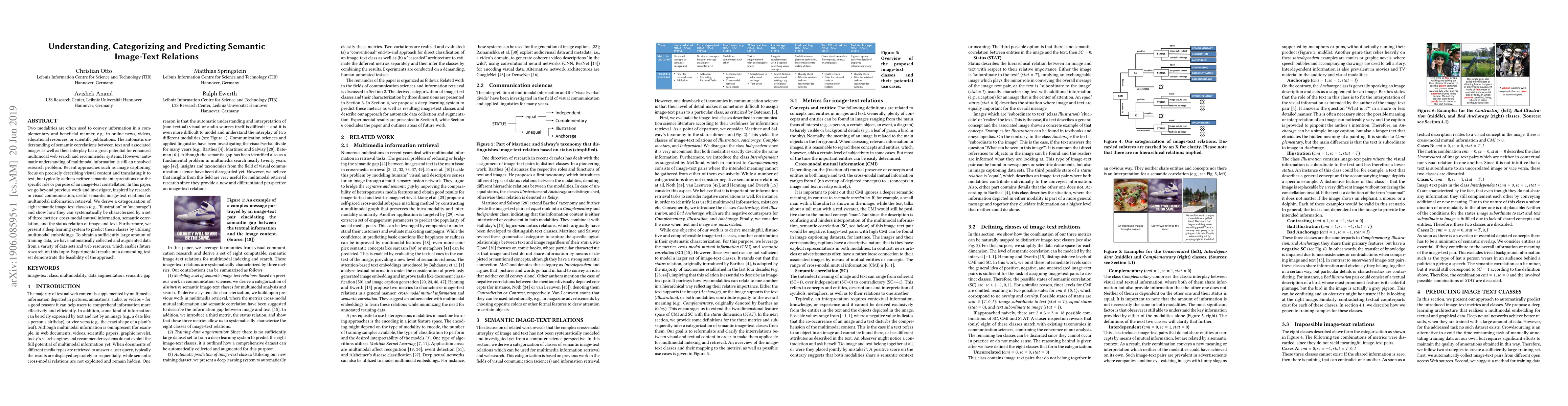 This paper explores and categorizes semantic relations between images and text, proposing eight distinct classes (e.g., "illustration"). It introduces metrics to characterize these relations and presents a deep learning model for predicting them, demonstrating its feasibility through experiments on a test set.