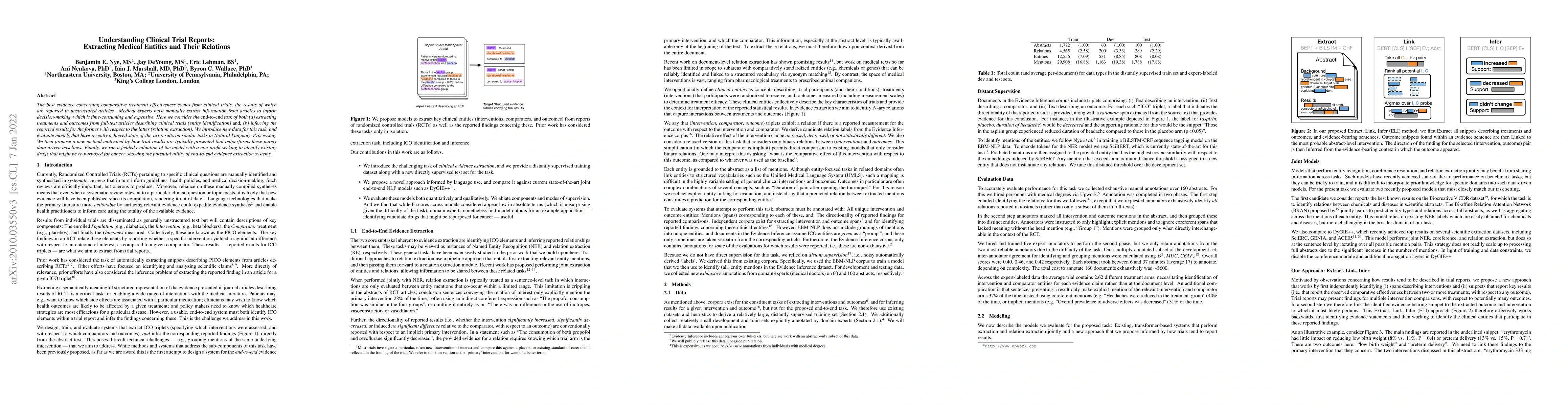 Researchers developed an end-to-end system to extract medical entities and their relations from clinical trial reports, outperforming existing models in entity identification and relation extraction. The system has potential utility for non-profit organizations looking to identify re-purposable drugs for cancer treatment.