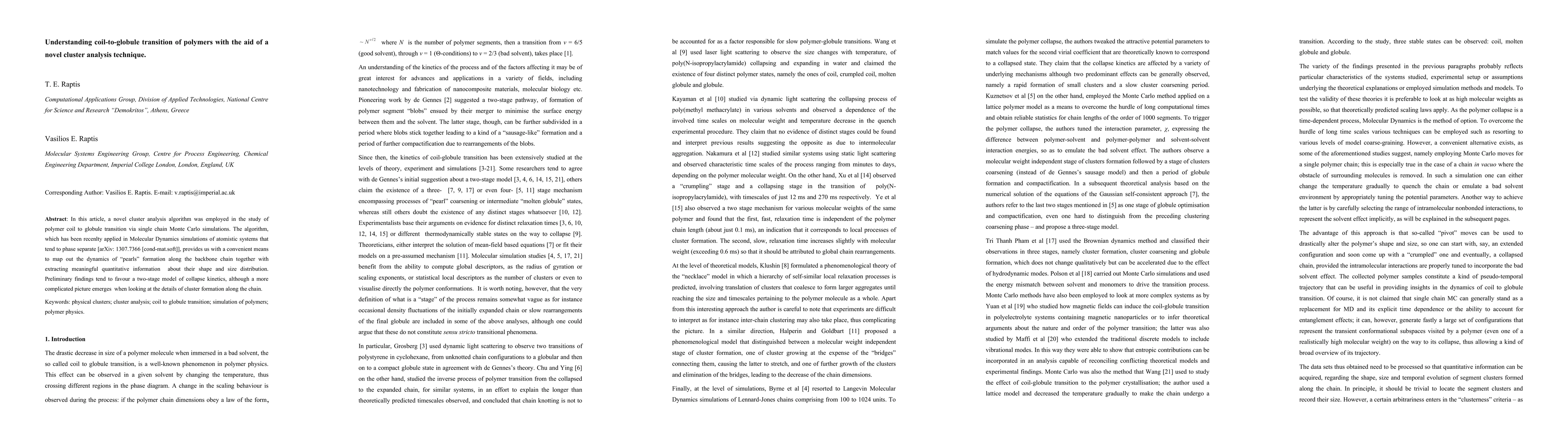 This paper employs a novel cluster analysis technique to study the coil-to-globule transition in polymers using single chain Monte Carlo simulations, revealing a two-stage model of collapse kinetics with complex cluster formation dynamics. The algorithm provides insights into the shape and size distribution of "pearls" along the polymer chain.