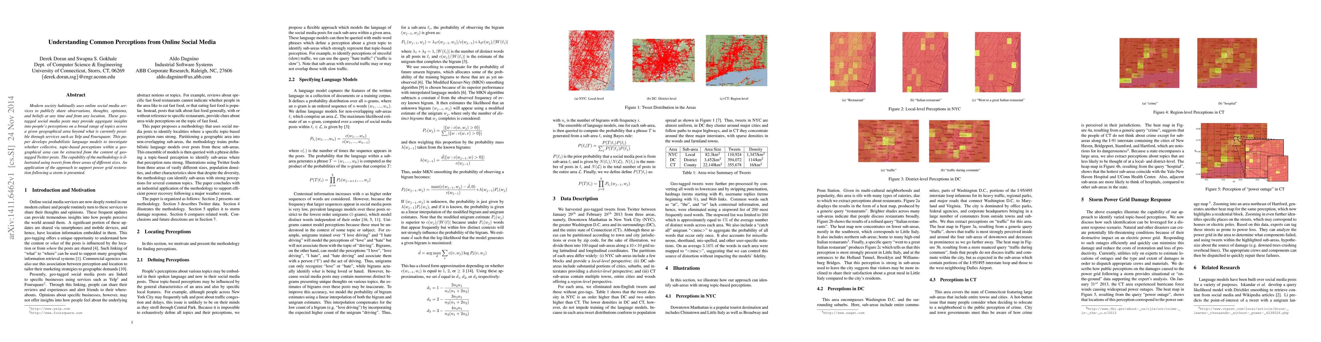 This paper develops probabilistic language models to extract collective, topic-based perceptions from geotagged Twitter posts, demonstrating the methodology's potential through case studies in areas of varying sizes, and showcasing its application in aiding power grid restoration post-storm.