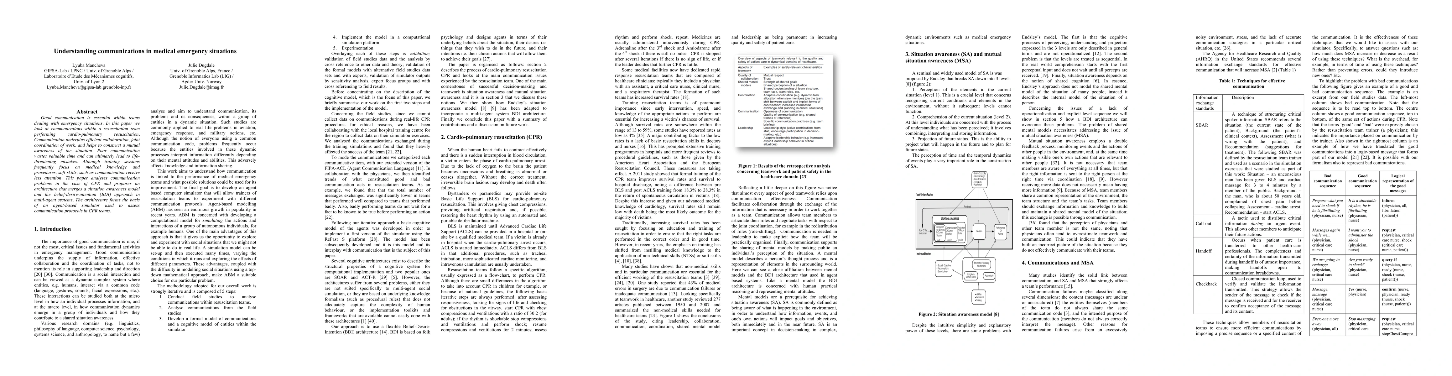 Good communication is essential within teams dealing with emergency situations. In this paper we look at communications within a resuscitation team performing cardio-pulmonary resuscitation. Communication underpins efficient collaboration, joint coordination of work, and helps to construct a mutual awareness of the situation. Poor communication wastes valuable time and can ultimately lead to life-threatening mistakes. Although training sessions frequently focus on medical knowledge and procedures, soft skills, such as communication receive less attention. This paper analyses communication problems in the case of CPR and proposes an architecture that merges a situation awareness model and the belief-desire-intention (BDI) approach in multi-agent systems. The architecture forms the basis of an agent-based simulator used to assess communication protocols in CPR teams.