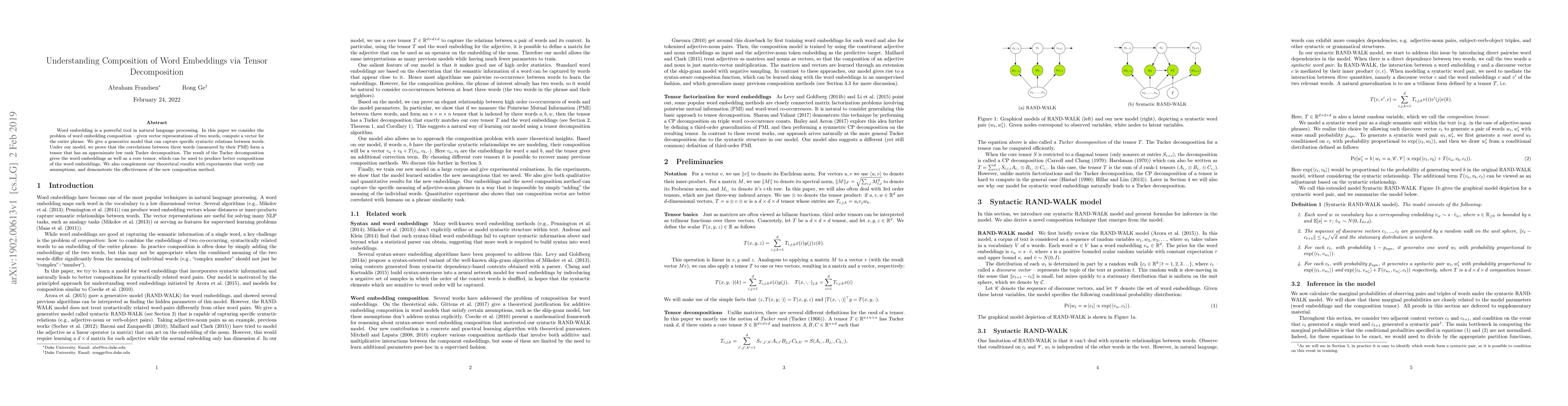 This paper proposes a generative model for word embedding composition using tensor decomposition, specifically a low-rank Tucker decomposition, to capture syntactic relations. Experiments validate the theoretical model and demonstrate improved phrase composition.