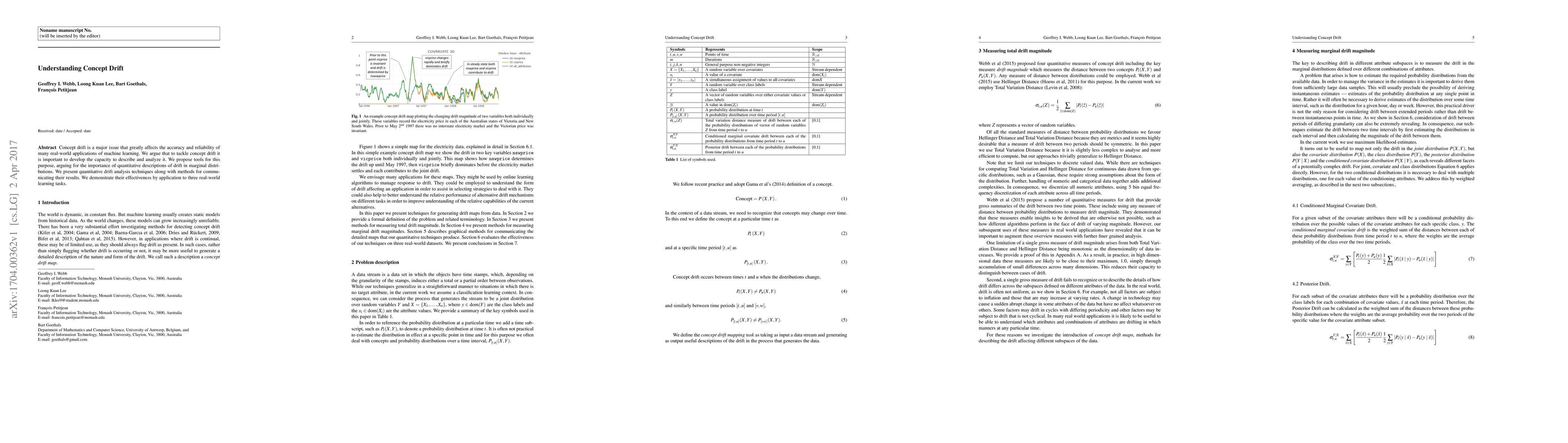 This paper discusses the challenge of concept drift in machine learning and proposes tools for its quantitative analysis and description, emphasizing the importance of drift in marginal distributions. It presents effective drift analysis techniques and demonstrates their application in real-world learning tasks.