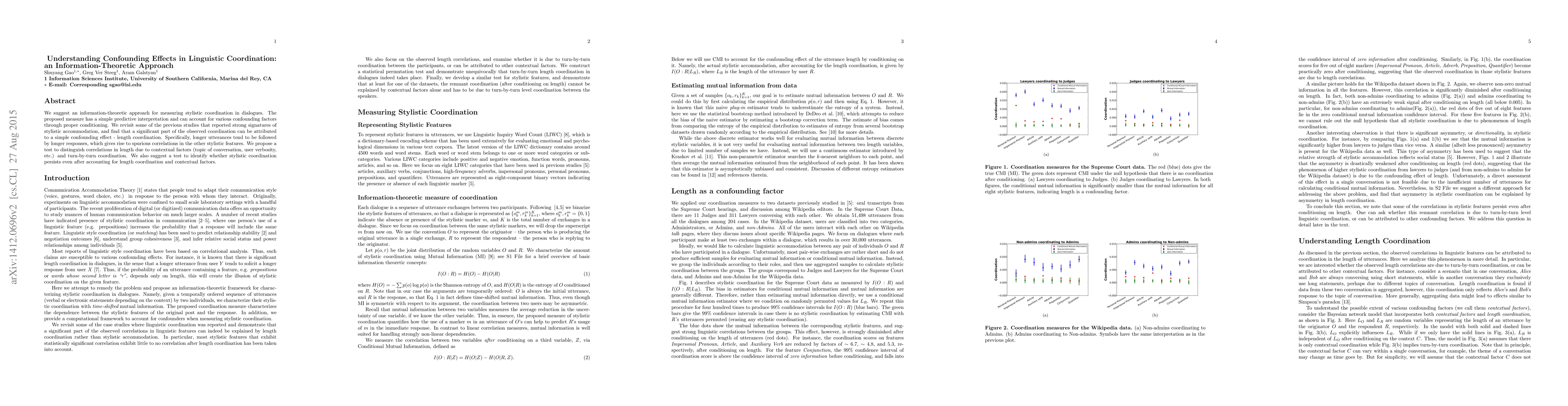Research proposes an information-theoretic approach to measure stylistic coordination in dialogues, finding that a significant part of observed coordination can be attributed to length coordination, which is distinct from actual turn-by-turn coordination.