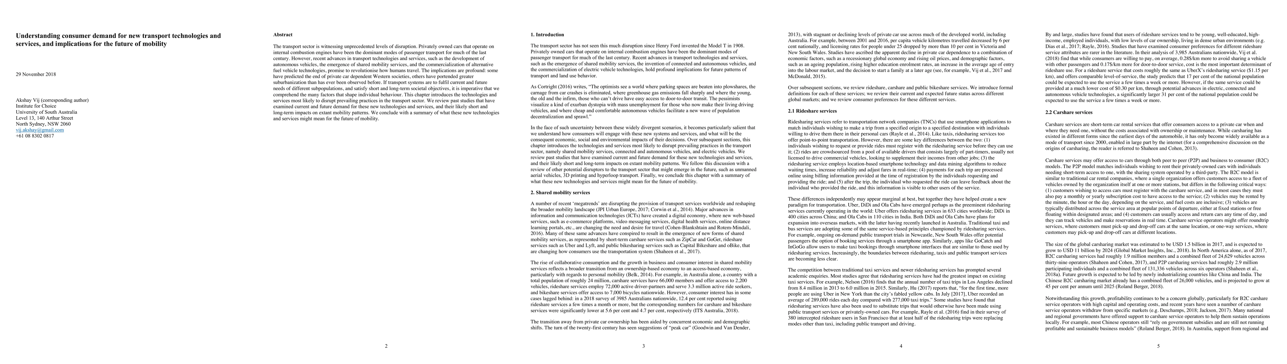 This paper explores emerging transport technologies, including autonomous vehicles and shared mobility services, and their potential to disrupt traditional passenger transport. It reviews studies on consumer demand for these innovations and discusses their implications for future mobility patterns and societal objectives.