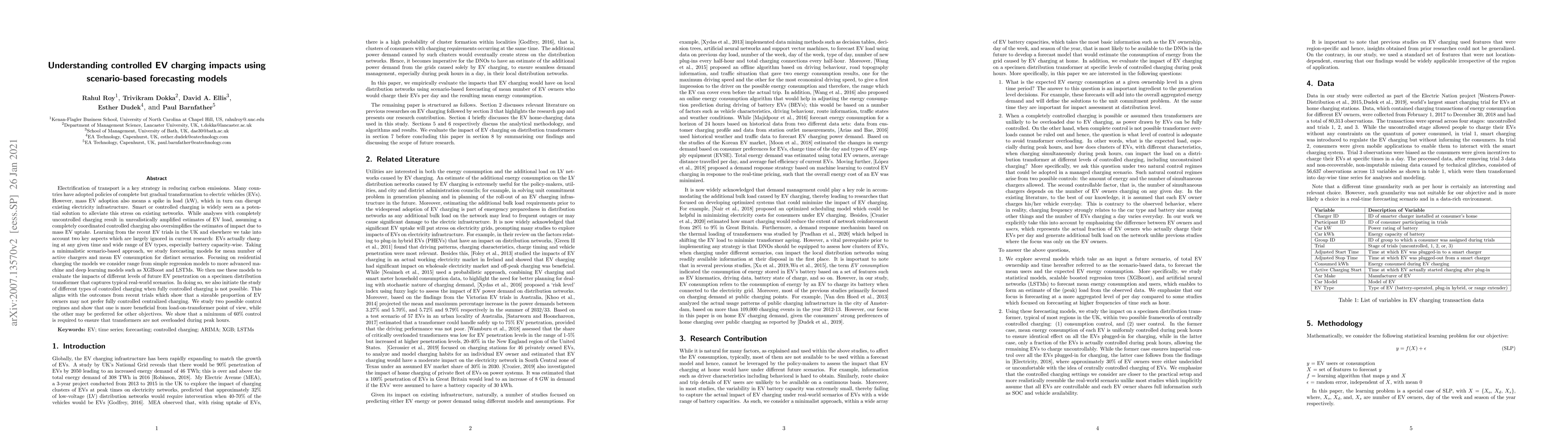 Electrification of transport is a key strategy in reducing carbon emissions. Many countries have adopted policies of complete but gradual transformation to electric vehicles (EVs). However, mass EV adoption also means a spike in load (kW), which in turn can disrupt existing electricity infrastructure. Smart or controlled charging is widely seen as a potential solution to alleviate this stress on existing networks. Learning from the recent EV trials in the UK and elsewhere we take into account two key aspects which are largely ignored in current research: EVs actually charging at any given time and wide range of EV types, especially battery capacity-wise. Taking a minimalistic scenario-based approach, we study forecasting models for mean number of active chargers and mean EV consumption for distinct scenarios. Focusing on residential charging the models we consider range from simple regression models to more advanced machine and deep learning models such as XGBoost and LSTMs. We then use these models to evaluate the impacts of different levels of future EV penetration on a specimen distribution transformer that captures typical real-world scenarios. In doing so, we also initiate the study of different types of controlled charging when fully controlled charging is not possible. This aligns with the outcomes from recent trials which show that a sizeable proportion of EV owners may not prefer fully controlled centralized charging. We study two possible control regimes and show that one is more beneficial from load-on-transformer point of view, while the other may be preferred for other objectives. We show that a minimum of 60% control is required to ensure that transformers are not overloaded during peak hours.