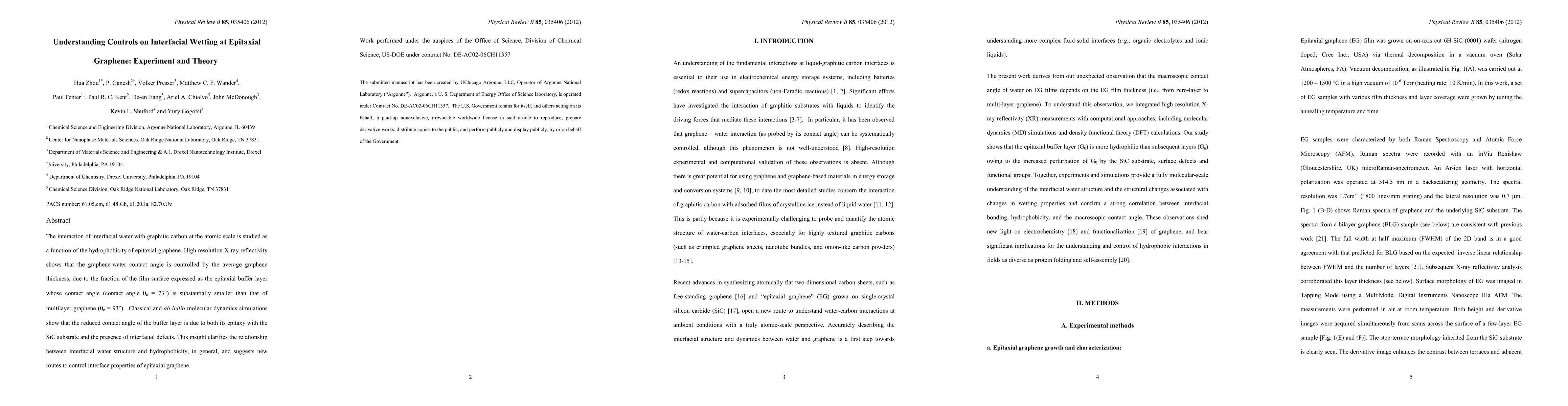 This study investigates how interfacial water interacts with epitaxial graphene, revealing that the graphene-water contact angle is influenced by the graphene thickness and the presence of the epitaxial buffer layer. High-resolution X-ray reflectivity and molecular dynamics simulations demonstrate that the buffer layer's reduced contact angle is due to its epitaxy with the SiC substrate and interfacial defects, providing insights into controlling the hydrophobicity of epitaxial graphene.