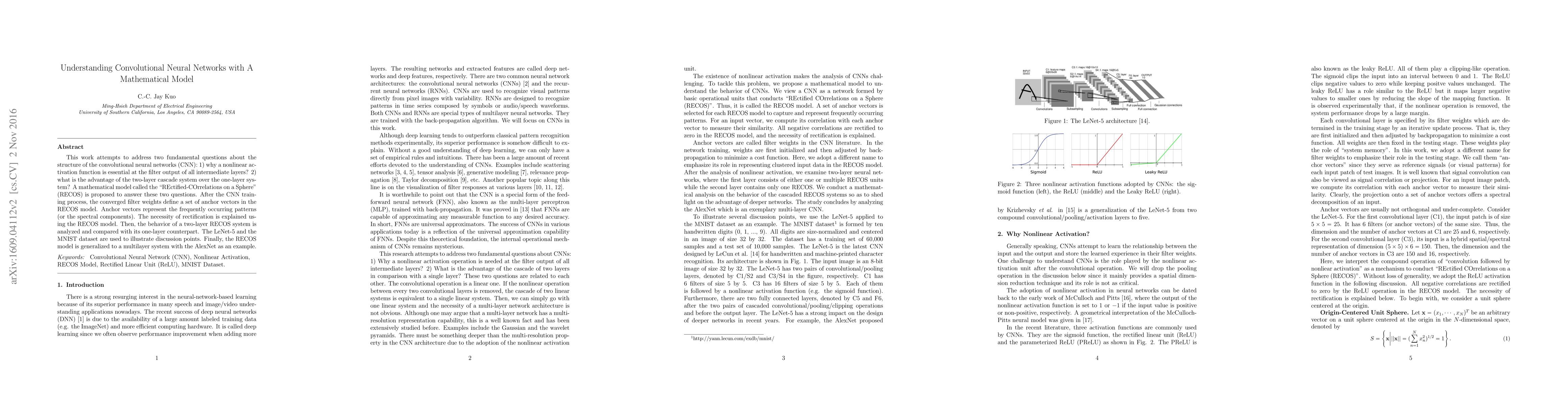 This work attempts to address two fundamental questions about the structure of the convolutional neural networks (CNN): 1) why a non-linear activation function is essential at the filter output of every convolutional layer? 2) what is the advantage of the two-layer cascade system over the one-layer system? A mathematical model called the "REctified-COrrelations on a Sphere" (RECOS) is proposed to answer these two questions. After the CNN training process, the converged filter weights define a set of anchor vectors in the RECOS model. Anchor vectors represent the frequently occurring patterns (or the spectral components). The necessity of rectification is explained using the RECOS model. Then, the behavior of a two-layer RECOS system is analyzed and compared with its one-layer counterpart. The LeNet-5 and the MNIST dataset are used to illustrate discussion points. Finally, the RECOS model is generalized to a multi-layer system with the AlexNet as an example. Keywords: Convolutional Neural Network (CNN), Nonlinear Activation, RECOS Model, Rectified Linear Unit (ReLU), MNIST Dataset.