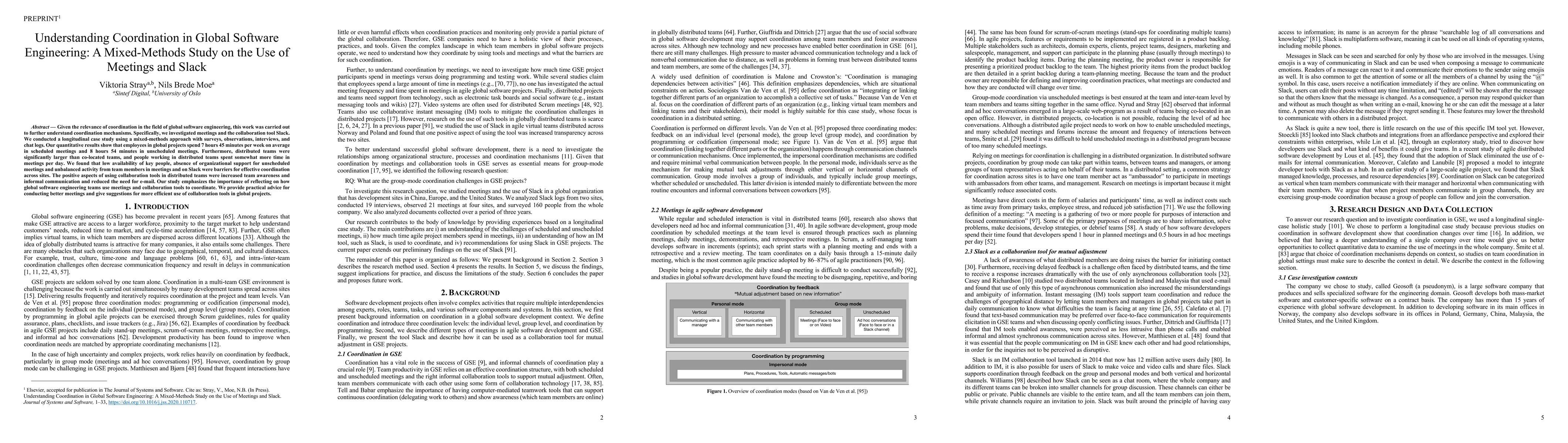 This study explores coordination mechanisms in global software engineering through a mixed-methods approach, revealing that employees spend significant time in both scheduled and unscheduled meetings. It highlights barriers to effective coordination and suggests improvements for meetings and collaboration tools.