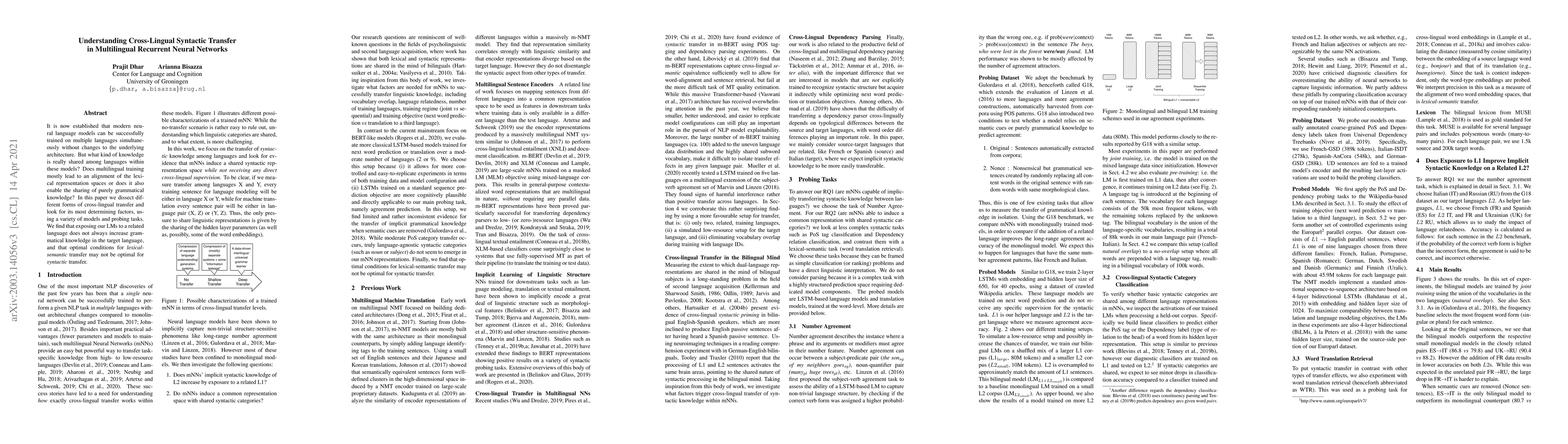 It is now established that modern neural language models can be successfully trained on multiple languages simultaneously without changes to the underlying architecture. But what kind of knowledge is really shared among languages within these models? Does multilingual training mostly lead to an alignment of the lexical representation spaces or does it also enable the sharing of purely grammatical knowledge? In this paper we dissect different forms of cross-lingual transfer and look for its most determining factors, using a variety of models and probing tasks. We find that exposing our LMs to a related language does not always increase grammatical knowledge in the target language, and that optimal conditions for lexical-semantic transfer may not be optimal for syntactic transfer.