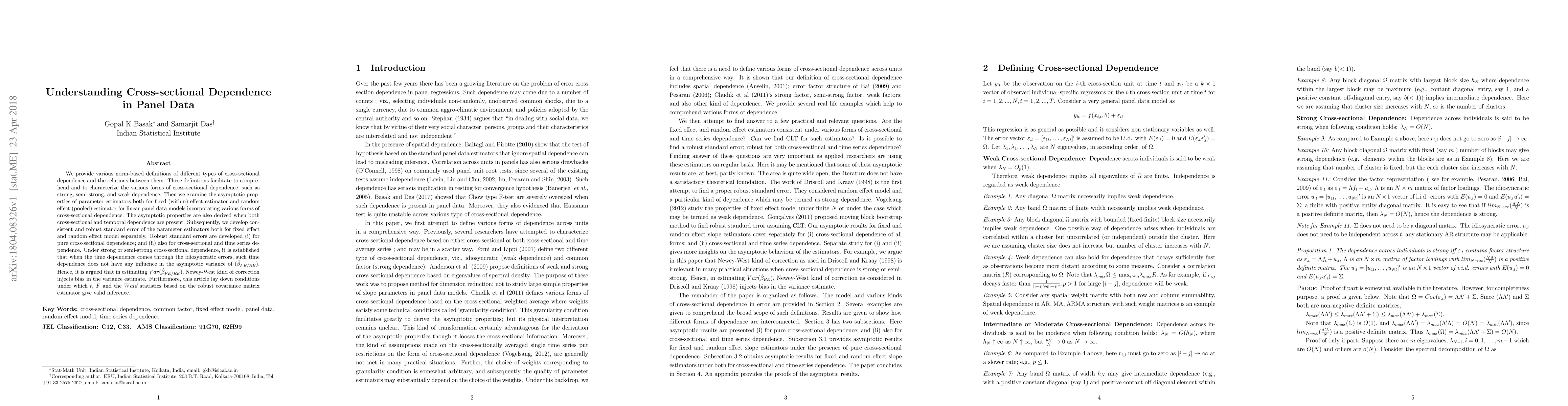 This paper defines various types of cross-sectional dependence in panel data and examines the asymptotic properties of estimators for fixed and random effect models under these dependencies. It also develops robust standard errors for parameter estimators, arguing that Newey-West corrections introduce bias when time dependence is through idiosyncratic errors.