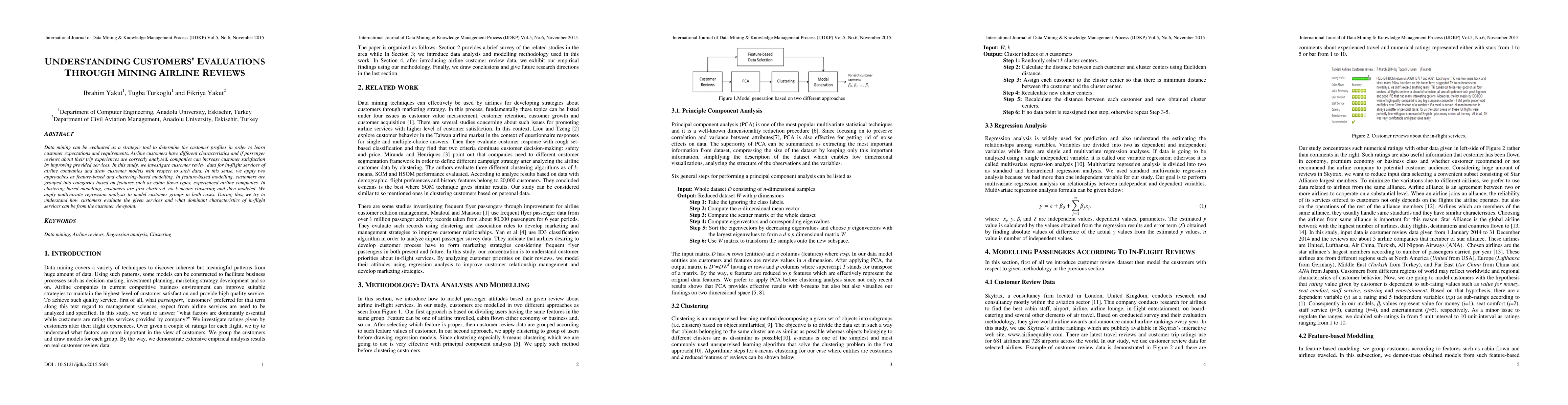This study employs data mining techniques to analyze airline customer reviews and develop customer models based on in-flight service experiences. It uses feature-based and clustering-based modeling to categorize customers and employs multivariate regression analysis to understand customer evaluations and dominant service characteristics.
