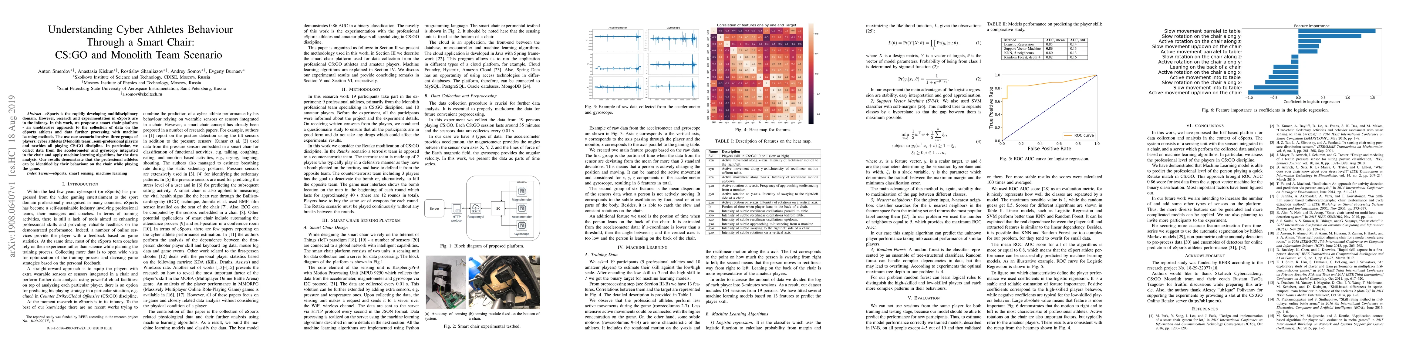 eSports is the rapidly developing multidisciplinary domain. However, research and experimentation in eSports are in the infancy. In this work, we propose a smart chair platform - an unobtrusive approach to the collection of data on the eSports athletes and data further processing with machine learning methods. The use case scenario involves three groups of players: `cyber athletes' (Monolith team), semi-professional players and newbies all playing CS:GO discipline. In particular, we collect data from the accelerometer and gyroscope integrated in the chair and apply machine learning algorithms for the data analysis. Our results demonstrate that the professional athletes can be identified by their behaviour on the chair while playing the game.