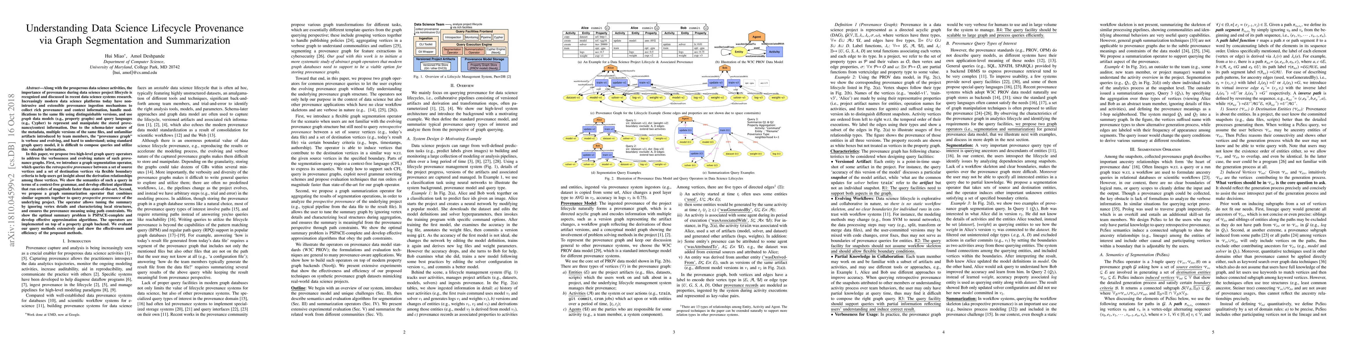 This paper proposes two high-level graph query operators to manage and simplify the verbose and evolving provenance graphs in data science platforms. The graph segmentation operator extracts insights from retrospective provenance based on flexible criteria, while the graph summarization operator combines similar segments to query prospective provenance, offering tunable summaries and ensuring meaningful results. Both operators are implemented on a property graph backend and demonstrated to be efficient and effective.