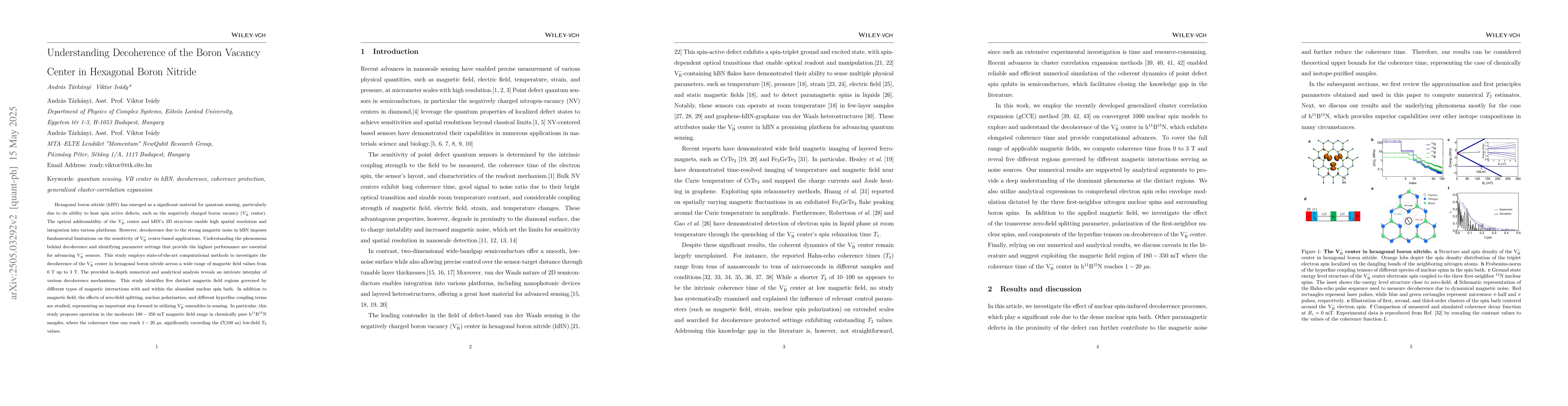 The paper presents a detailed theoretical investigation of the coherence dynamics of the V−B center in h11B15N using advanced computational methods, including first-principles DFT calculations and the gCCE3 method.