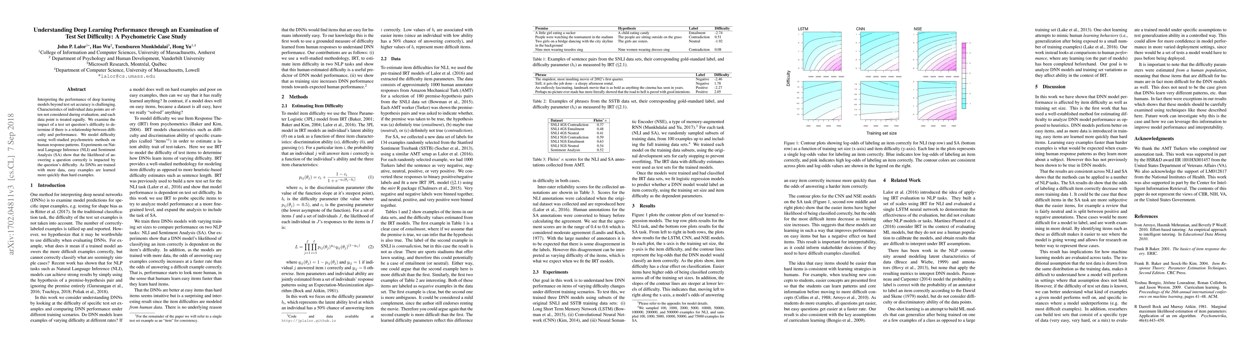 This study investigates how test set difficulty affects deep learning model performance using psychometric methods, revealing that question difficulty correlates with the likelihood of correct answers. Experiments on Natural Language Inference and Sentiment Analysis show that deep neural networks learn easy examples faster than hard ones, suggesting a need to consider data point characteristics in model evaluations.