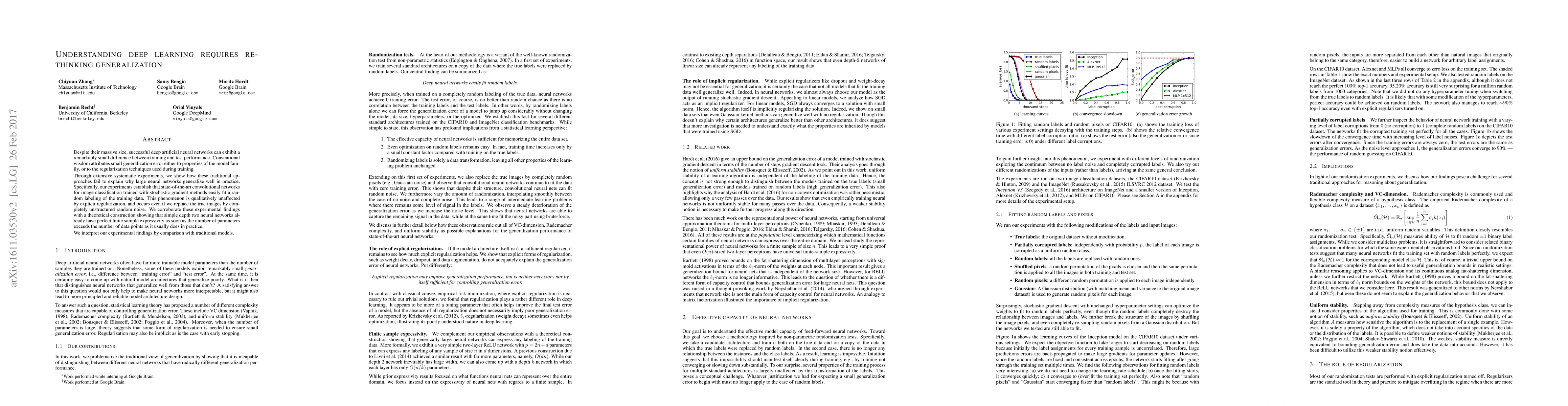 Despite their massive size, successful deep artificial neural networks can exhibit a remarkably small difference between training and test performance. Conventional wisdom attributes small generalization error either to properties of the model family, or to the regularization techniques used during training. Through extensive systematic experiments, we show how these traditional approaches fail to explain why large neural networks generalize well in practice. Specifically, our experiments establish that state-of-the-art convolutional networks for image classification trained with stochastic gradient methods easily fit a random labeling of the training data. This phenomenon is qualitatively unaffected by explicit regularization, and occurs even if we replace the true images by completely unstructured random noise. We corroborate these experimental findings with a theoretical construction showing that simple depth two neural networks already have perfect finite sample expressivity as soon as the number of parameters exceeds the number of data points as it usually does in practice. We interpret our experimental findings by comparison with traditional models.
