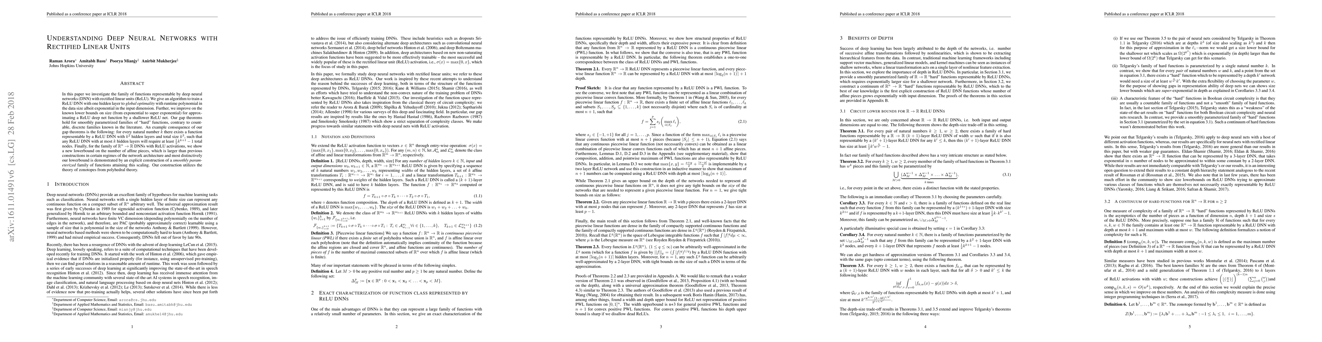 In this paper we investigate the family of functions representable by deep neural networks (DNN) with rectified linear units (ReLU). We give an algorithm to train a ReLU DNN with one hidden layer to *global optimality* with runtime polynomial in the data size albeit exponential in the input dimension. Further, we improve on the known lower bounds on size (from exponential to super exponential) for approximating a ReLU deep net function by a shallower ReLU net. Our gap theorems hold for smoothly parametrized families of "hard" functions, contrary to countable, discrete families known in the literature. An example consequence of our gap theorems is the following: for every natural number $k$ there exists a function representable by a ReLU DNN with $k^2$ hidden layers and total size $k^3$, such that any ReLU DNN with at most $k$ hidden layers will require at least $\frac{1}{2}k^{k+1}-1$ total nodes. Finally, for the family of $\mathbb{R}^n\to \mathbb{R}$ DNNs with ReLU activations, we show a new lowerbound on the number of affine pieces, which is larger than previous constructions in certain regimes of the network architecture and most distinctively our lowerbound is demonstrated by an explicit construction of a *smoothly parameterized* family of functions attaining this scaling. Our construction utilizes the theory of zonotopes from polyhedral theory.