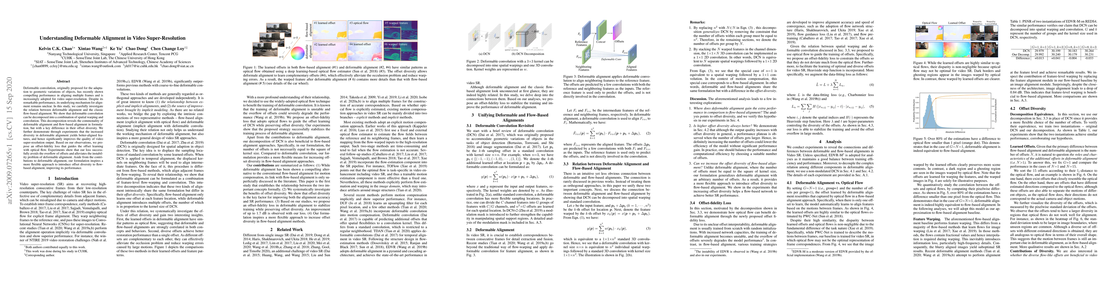 Deformable convolution, originally proposed for the adaptation to geometric variations of objects, has recently shown compelling performance in aligning multiple frames and is increasingly adopted for video super-resolution. Despite its remarkable performance, its underlying mechanism for alignment remains unclear. In this study, we carefully investigate the relation between deformable alignment and the classic flow-based alignment. We show that deformable convolution can be decomposed into a combination of spatial warping and convolution. This decomposition reveals the commonality of deformable alignment and flow-based alignment in formulation, but with a key difference in their offset diversity. We further demonstrate through experiments that the increased diversity in deformable alignment yields better-aligned features, and hence significantly improves the quality of video super-resolution output. Based on our observations, we propose an offset-fidelity loss that guides the offset learning with optical flow. Experiments show that our loss successfully avoids the overflow of offsets and alleviates the instability problem of deformable alignment. Aside from the contributions to deformable alignment, our formulation inspires a more flexible approach to introduce offset diversity to flow-based alignment, improving its performance.