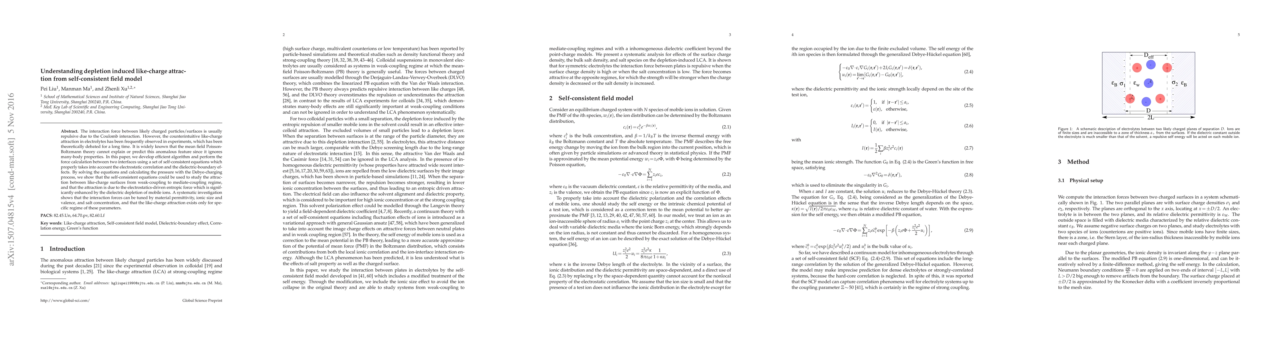 This paper develops a self-consistent field model to explain the counterintuitive like-charge attraction observed in electrolytes, attributing it to electrostatics-driven entropic forces enhanced by dielectric depletion. The model accurately predicts interaction forces tunable by material permittivity, ionic size, valence, and salt concentration.